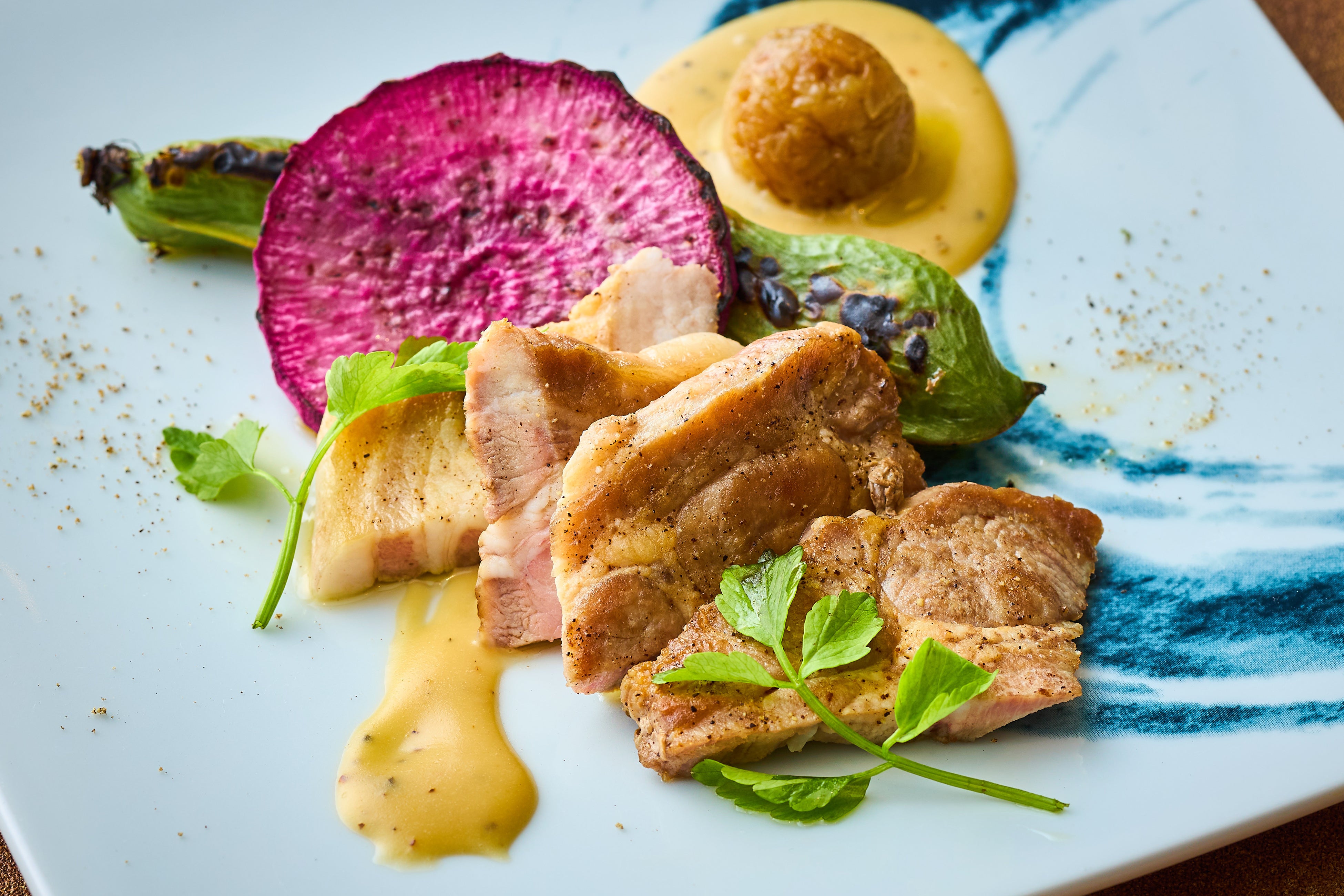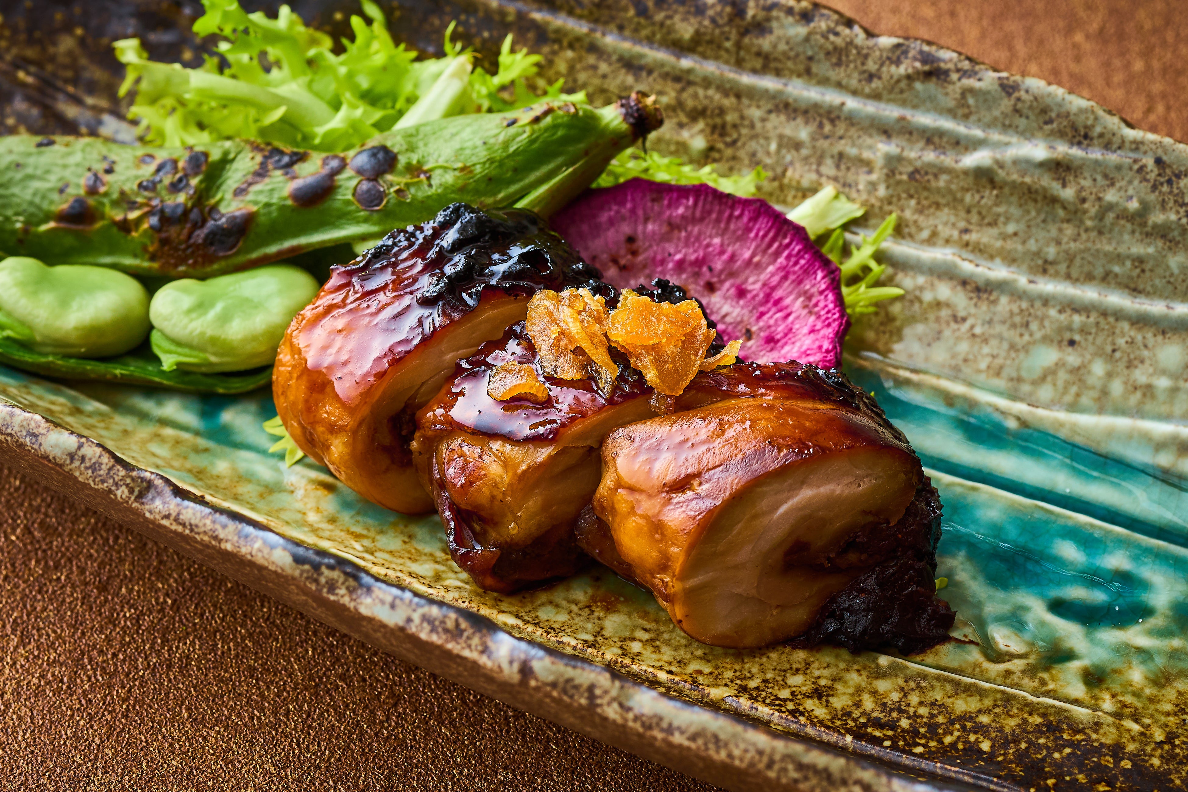 四季彩ランチは、メイン料理を旬香自慢の鉄板焼き、炭火焼きなどで調理した6種類からお選びいただけます。中でも『月替わりの炭火焼き(¥3,400)』では、毎月異なる旬の彩り野菜を楽しむことができます。3月はシャキシャキとした食感で歯ごたえの良い「春筍」を、炭火で香ばしく焼いて香りを引き立てます。さらに、脂身の質が良く旨みとコクがあり、舌触り滑らかな「山形豚」を炭火でさっと焼いて調理する“焼きしゃぶ”を一緒にご提供いたします。付け合わせの野菜やきのこも、本来の味を楽しめるようシンプルに昆布塩でお召し上がりください。