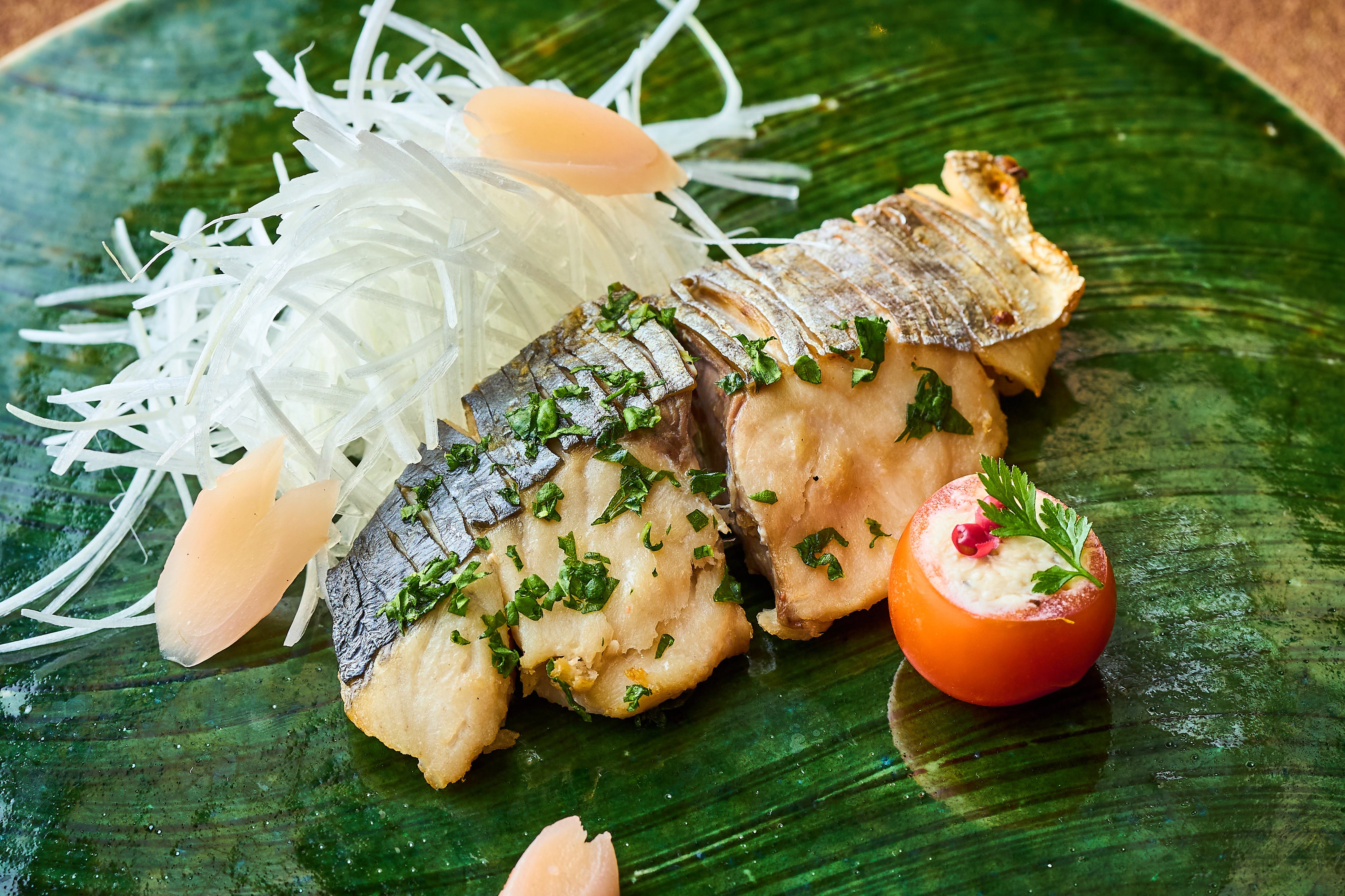 桜鯛の薄造りと帆立貝の酒盗ソース |