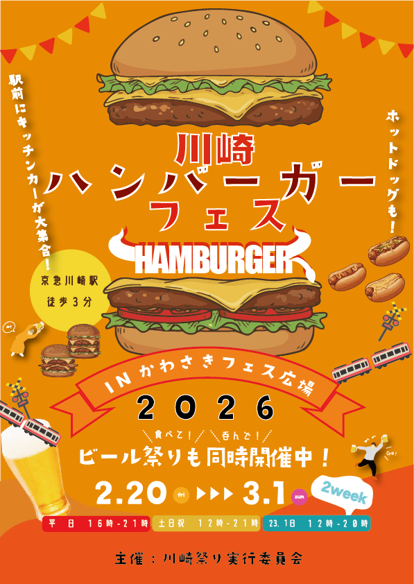 川崎駅前に“ハンバーガーフェス”がやってきます!「川崎ハンバーガーフェス」は、人気のキッチンカーが大集合!!ホットドッグ専門の店もあり、多種多様なお食事を楽しめます