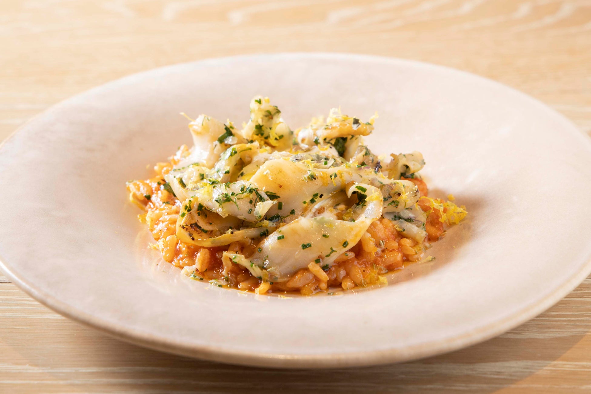 「メログラーノ」の後藤祐司シェフの料理は「富津漁協江戸前白ミルのリゾット トマトとレモン、オレガノ風味」と「大原産天然トラフグのフリット ながいき葉玉ねぎの柑橘蒸し添え」です。