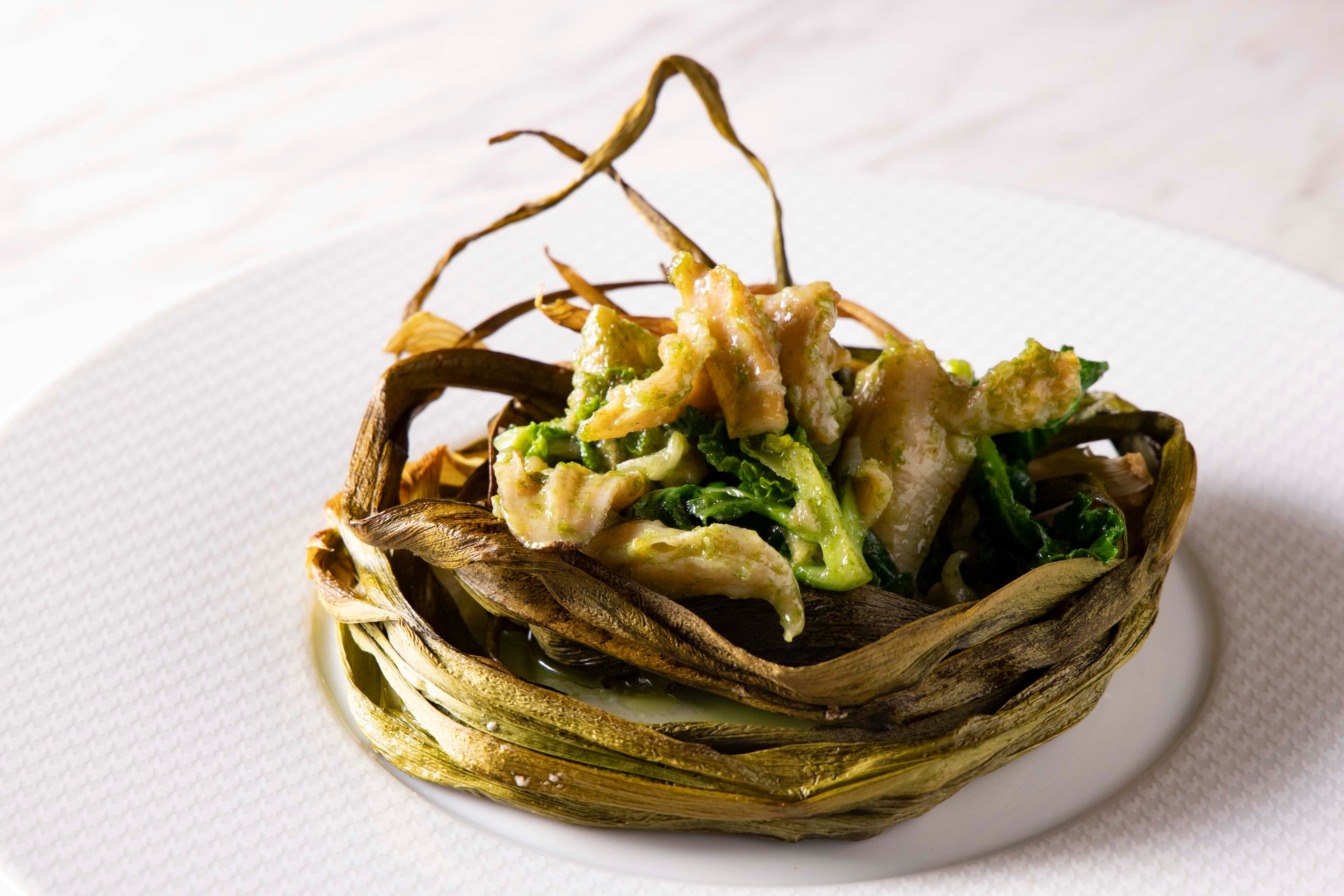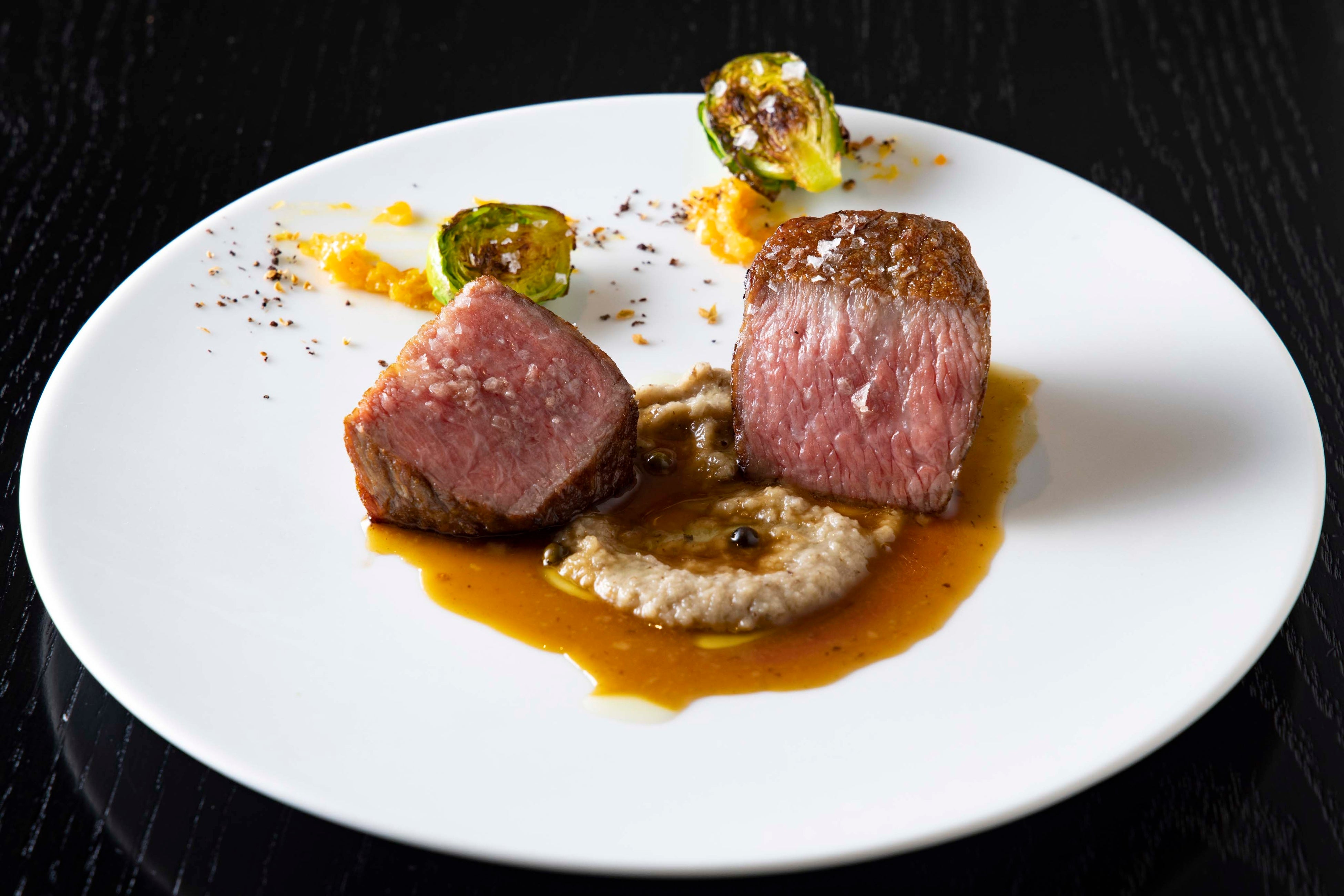 LA BONNE TABLEの中村和成シェフは「かずさ和牛の稲藁焼き、牛蒡、ティムールペッパー」と「銚子つりきんめ、サフランリゾット、蕪」で千葉の海と大地の豊穣を表現します。