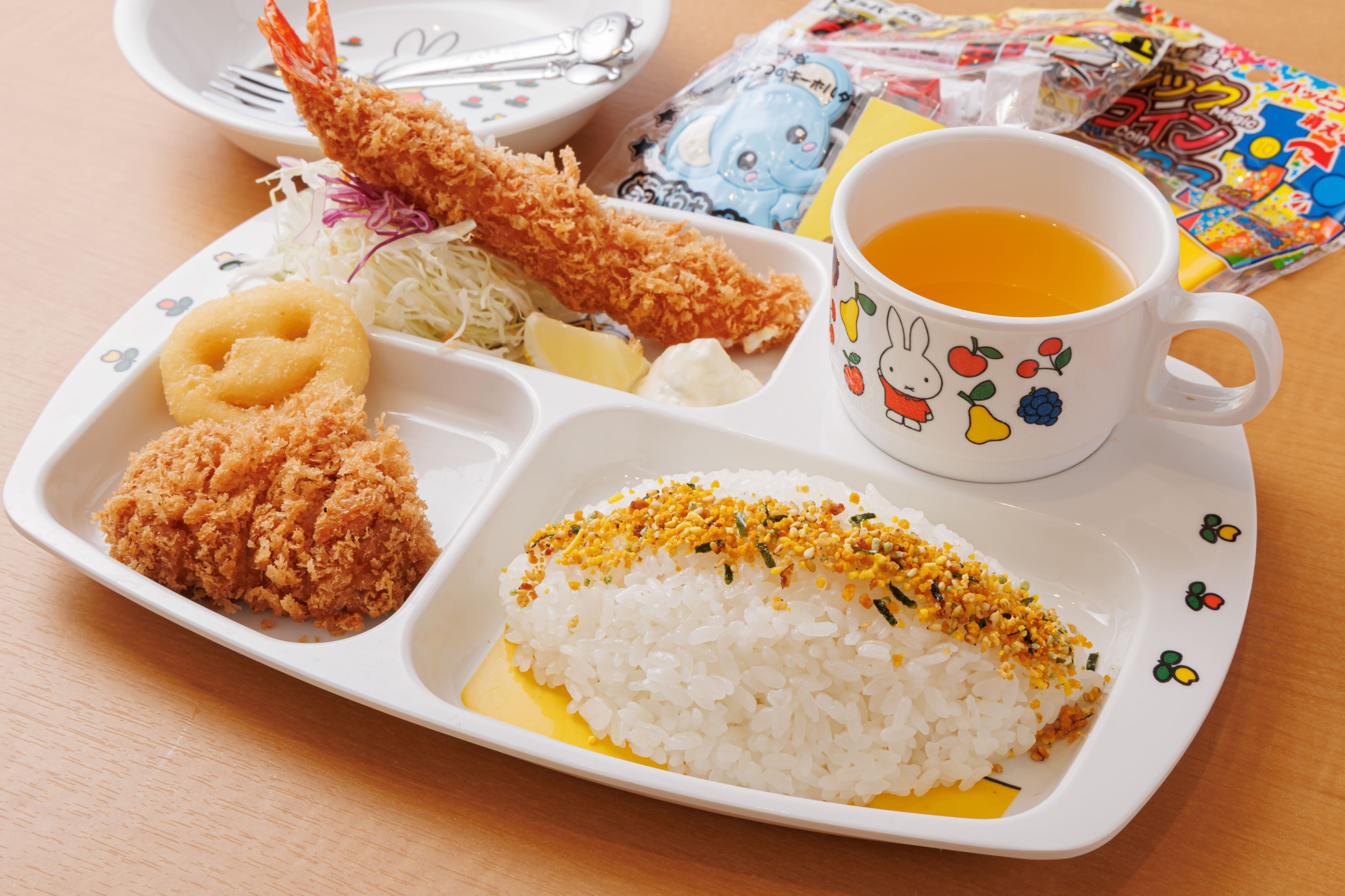 やわらかなひれかつに、ぷりぷりえびフライとスマイルポテトを添えたお子様向けセットです。ジュースとおもちゃ付きで、楽しいお食事の時間をお過ごしいただけます。