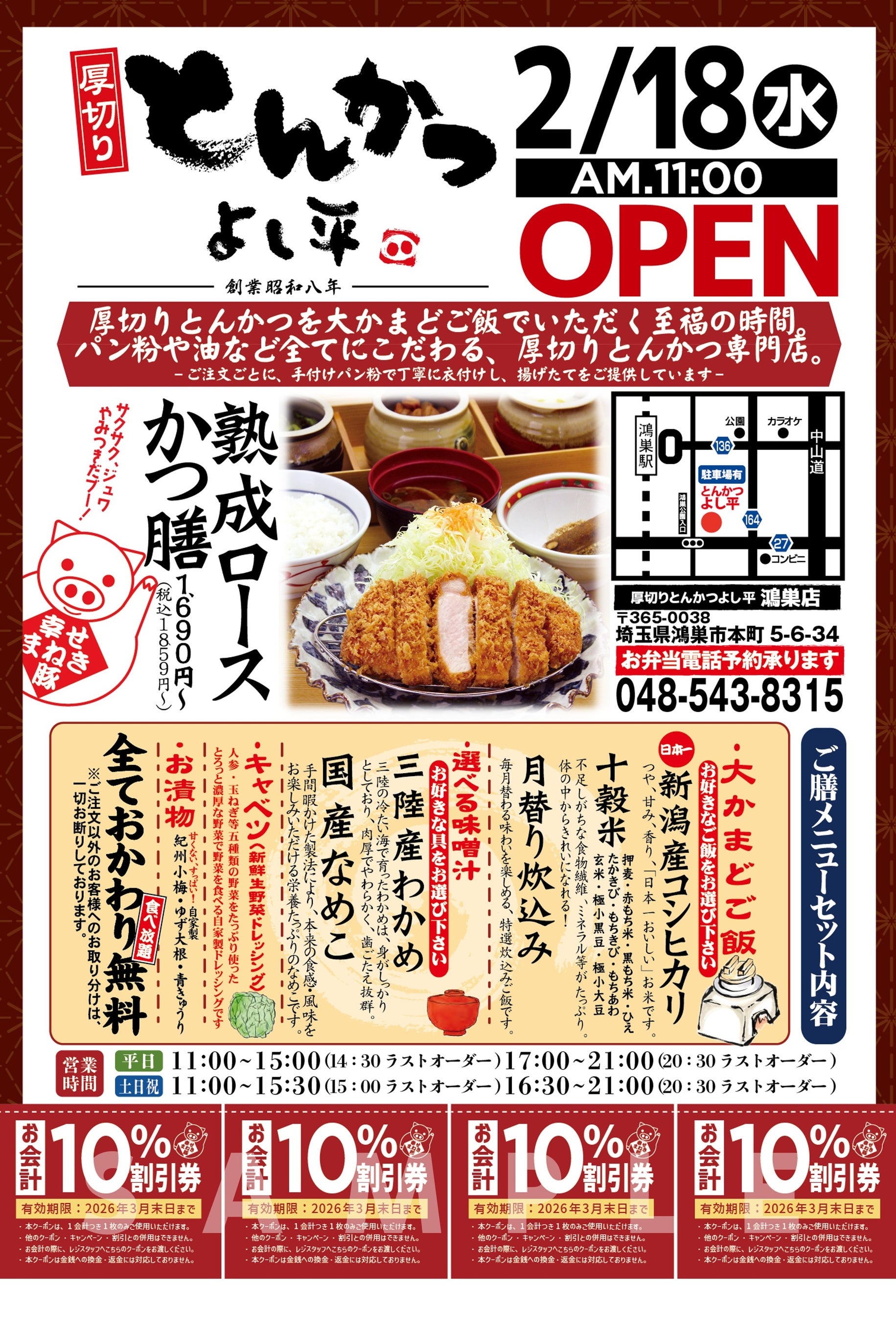 このたびオープンする『厚切りとんかつ よし平 鴻巣店』は、鴻巣駅から徒歩8分、埼玉県道27号東松山鴻巣線とひなの里通りが交わる立地にオープンいたします。周辺には寺院や公園などもあり、地域の皆さまの普段のお食事はもちろん、お出かけの途中にも気軽に立ち寄れるお店として、さまざまなシーンでお楽しみいただけます。