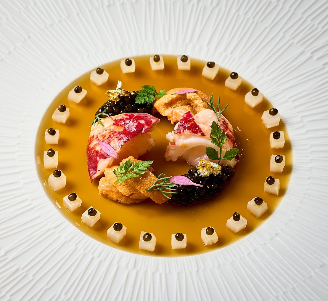 くちどけの良い澄んだオマール・ブルーのジュレに、雲丹と漆黒のキャビアの粒を時計盤のように精密に配した芸術的な一皿。