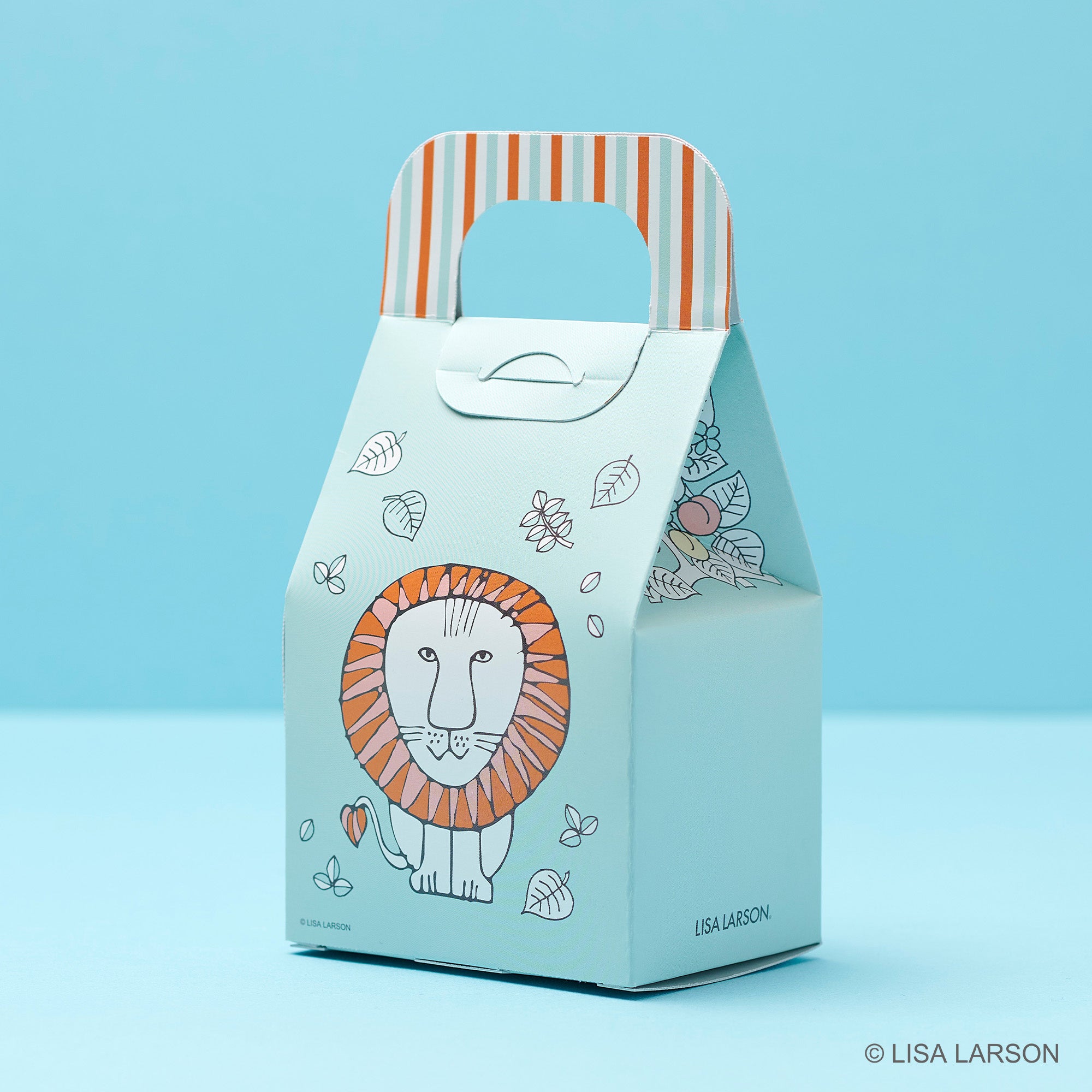 1枚1枚丁寧に焼き上げたほろほろ食感のクッキーを、リサ・ラーソンのスケッチを元にデザインされたマカロンカラーの小さなBOXに詰め込んで。豊かなアールグレイの香りが広がる、ほろりと口どけの良い食感のクッキーです。土台のクッキーを焼いた後、異なる生地を絞りトッピングして再度焼き上げる「2度焼き」製法。しっとり、ほろっとした多様な食感が楽しめます。爽やかなブルーにオレンジのストライプがアクセント。パティシエ帽の“マイキー”や、背面にたたずむライオンの“レオ”が愛らしいデザインです。