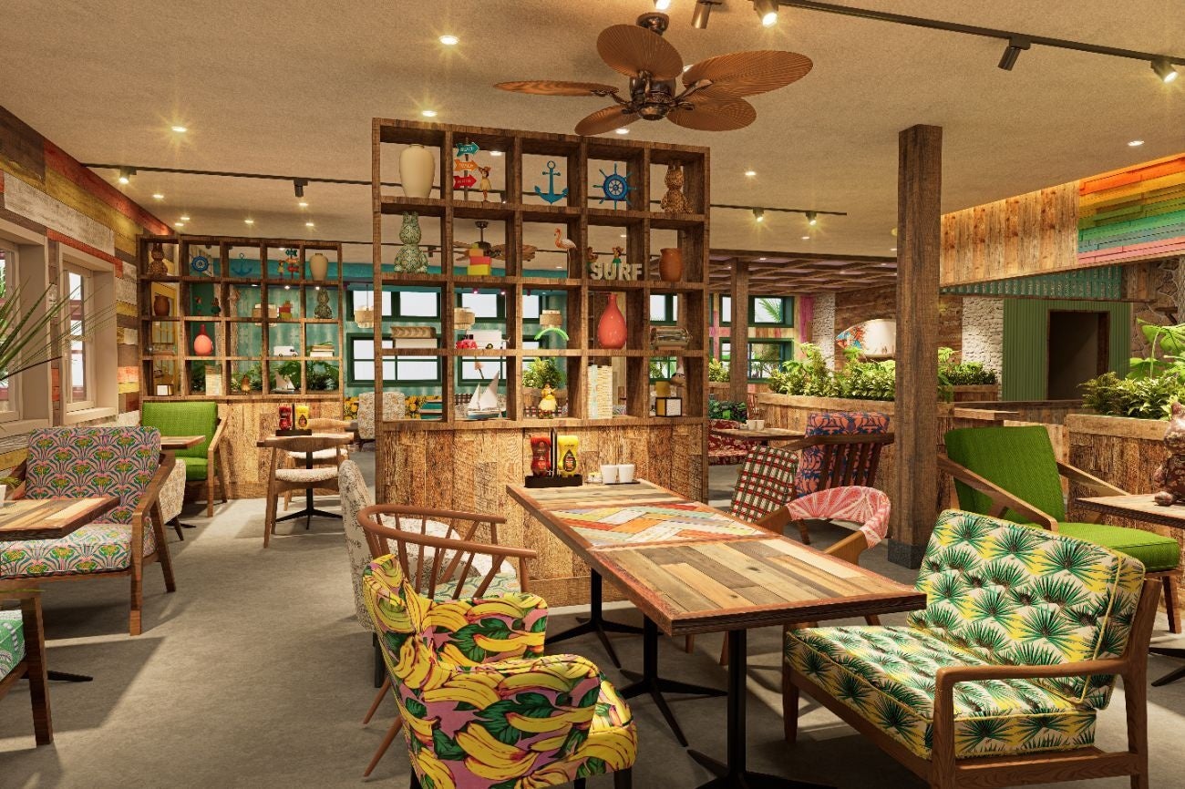 カラフルなハワイアン雑貨やサーフボードが飾られ、遊び心のあるソファやテーブルなどのこだわりのインテリアが、まるで、ハワイのローカルのリビングにいるような雰囲気を演出します。ゆったりとくつろげる空間で、日本にいながらハワイ気分を味わえます。