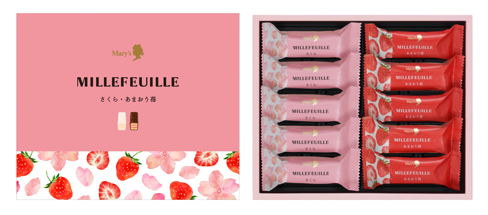「さくら」と「あまおう苺」、ミルフィーユのサクサク軽い食感と一緒に、2つの異なる春の味をお楽しみいただけます。