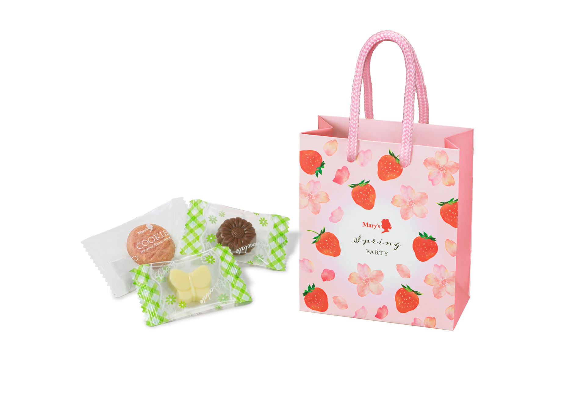 さくらといちごが愛らしく描かれたミニバッグには春を彩る花型やチョウ型のチョコレート、いちごのクッキーなどを詰め合わせました。