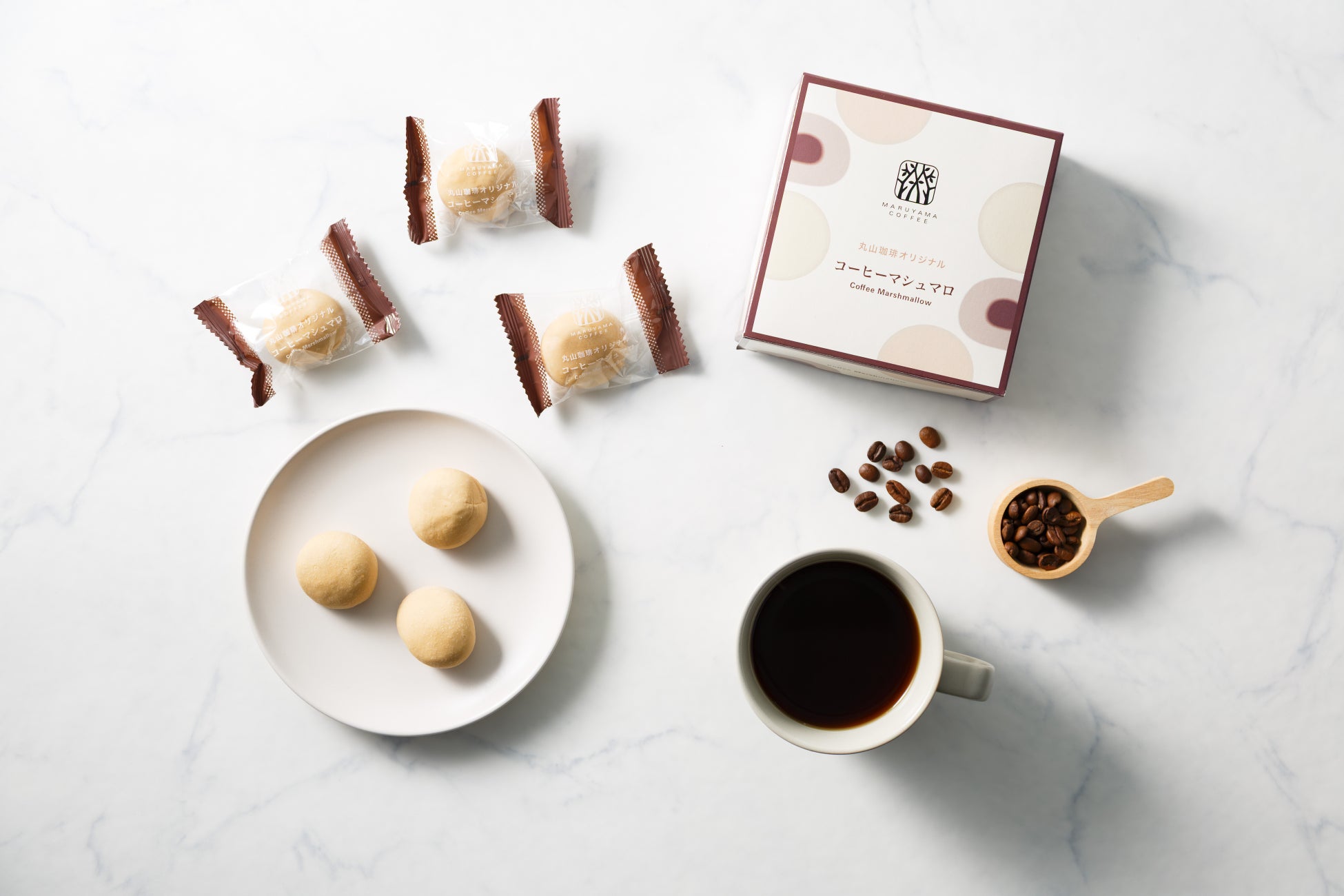 マシュマロの食感は110余年以上に渡ってマシュマロ製造に携わってきた、老舗の独自技術による”生地のきめ細やかさ”と”弾力”。空気をたっぷり抱き込みながら仕上げることで、生地のきめが細かく、ふんわりとしながらも弾力のある「もっちり」食感を実現しています。中に包み込んだコーヒークリームには、創業当初から愛され続けている丸山珈琲のブレンドコーヒーを使用。コーヒーの香ばしさと奥深いコク、ほろ苦い味わいを活かし、甘さの中にも大人っぽさを感じられるマシュマロに仕立てました。