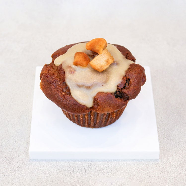 りんごジュースに漬け込んだセミドライりんごとレーズンを使用し、りんご本来の自然な甘さを最大限に引き出したケーキです。シナモンの香りと、ローストくるみの香ばしさ・食感が加わった相性抜群のコンビネーションが楽しめます。 仕上げにはメープルシロップと粉糖のアイシングをかけ、トップにもセミドライりんごをトッピング。メープルアイシングのやさしい甘みが全体を包み込む、見た目も味わいもほっとする一品です。