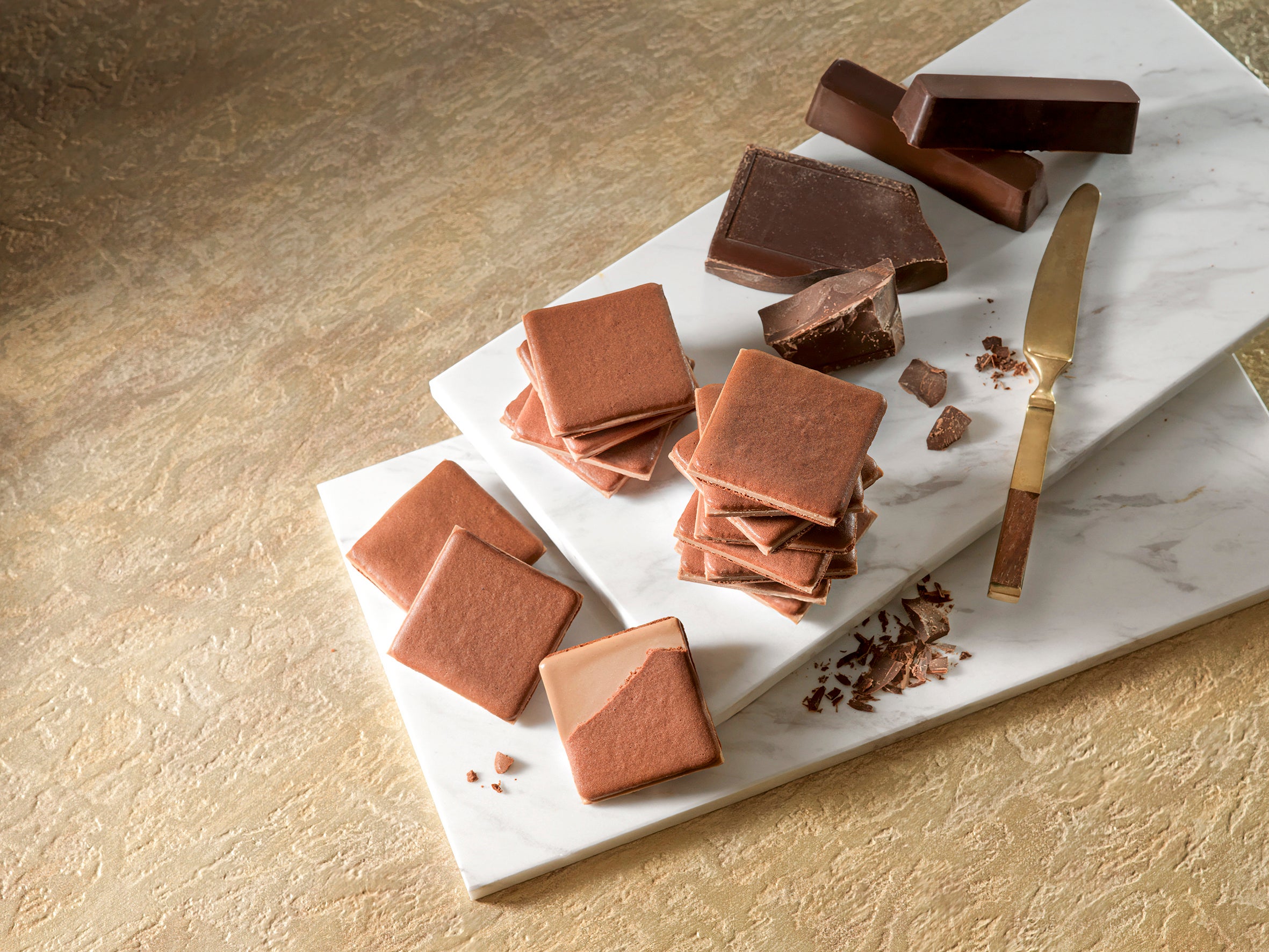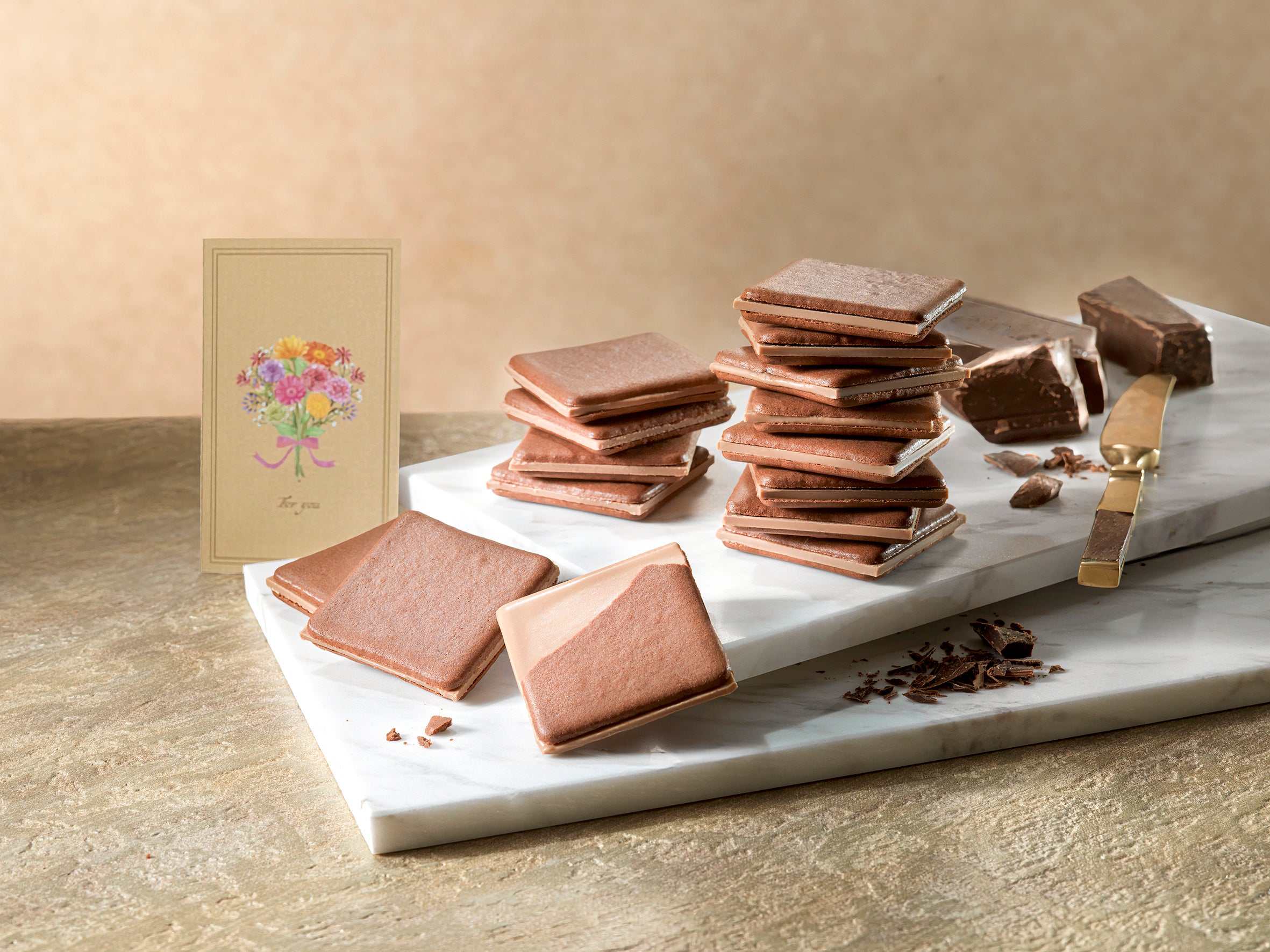 まろやかな口溶けのミルクチョコプレートをココア生地のクッキーではさんださっくりと軽やかなラングドシャです。