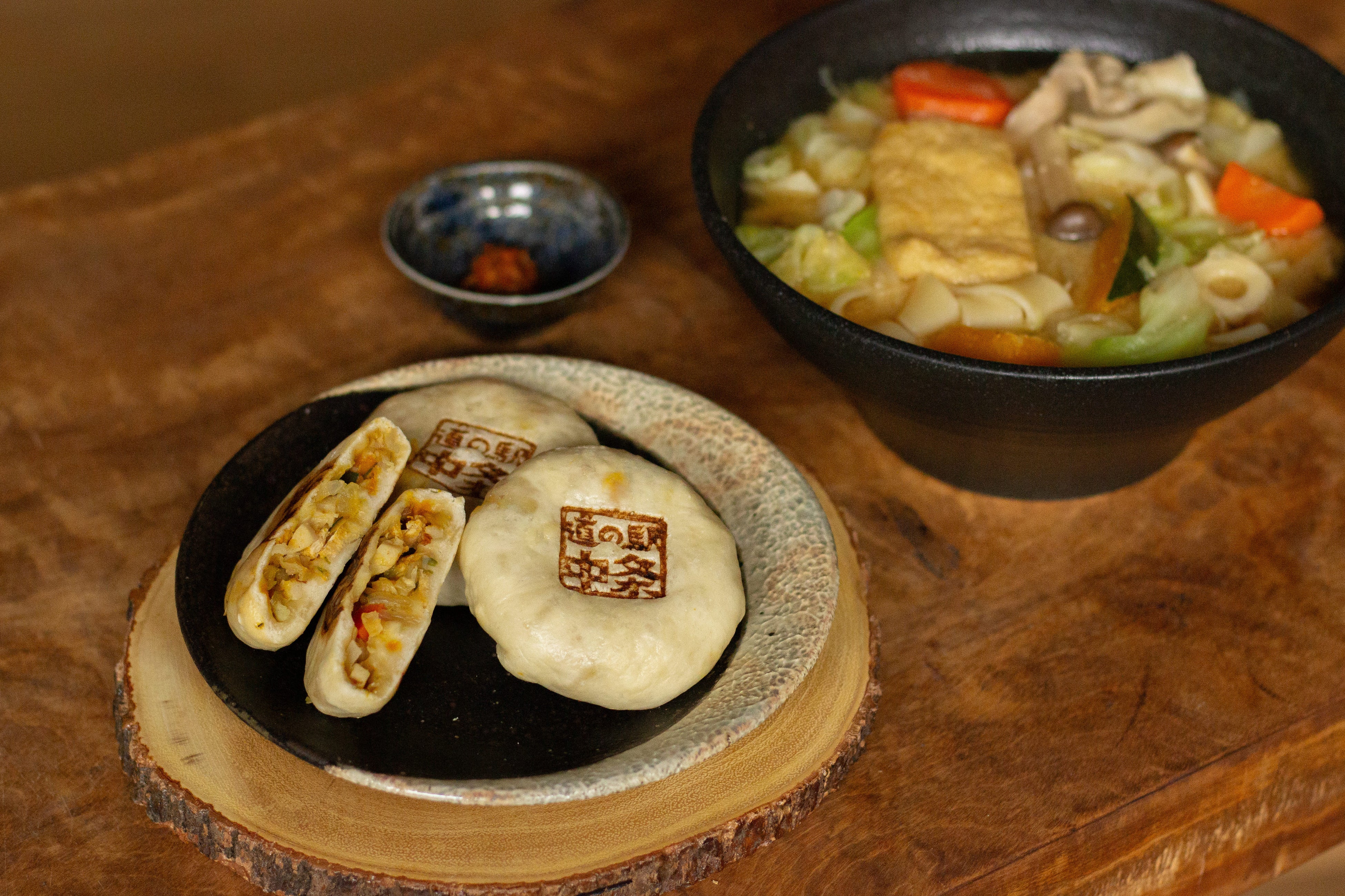長野県産小麦を使用した生地で、おぶっこ特有のもちもちとした平打ち麺の食感をおやきの皮で表現。