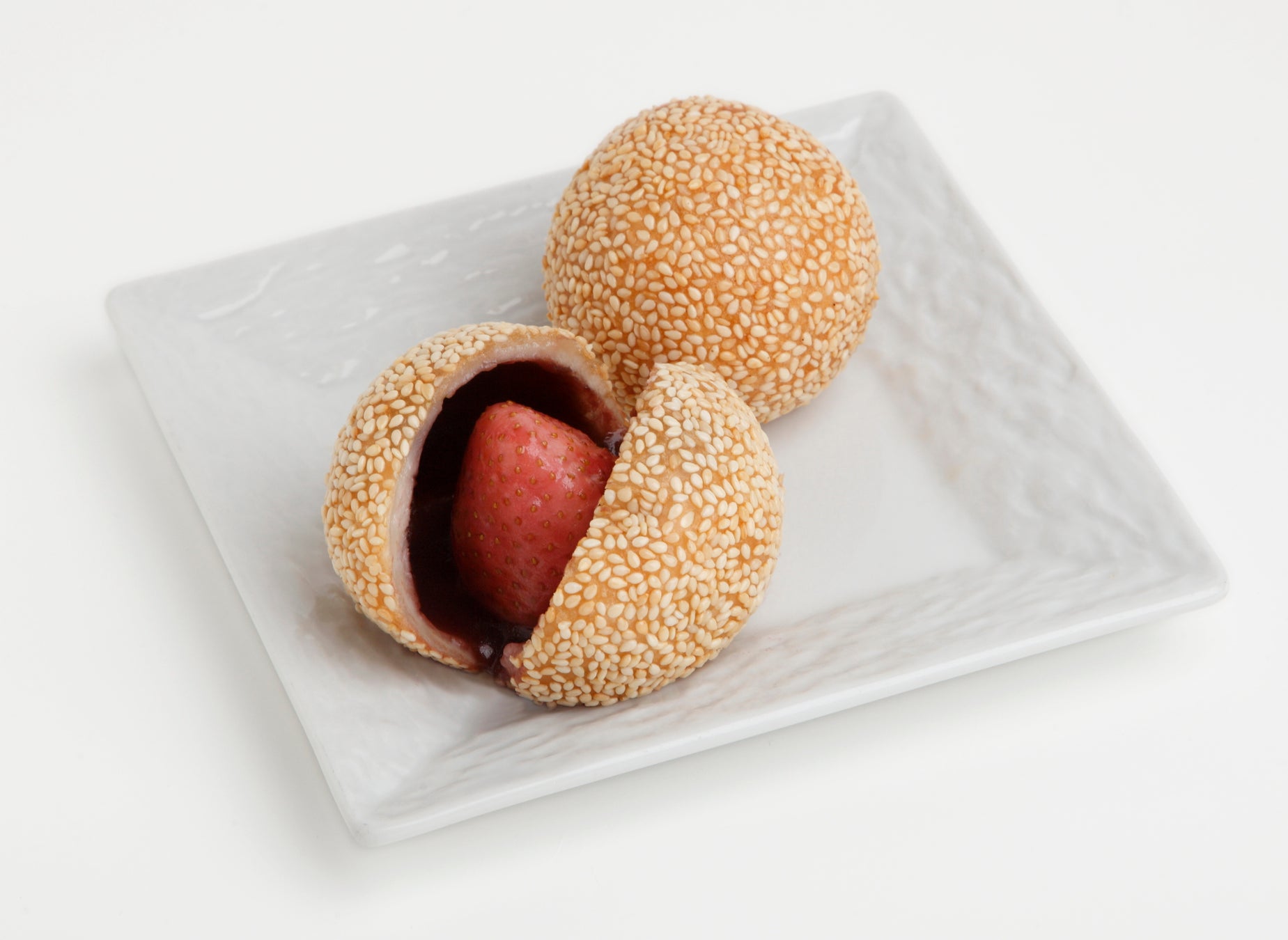 とちあいかをごま団子に入れて揚げました。とちあいかの甘酸っぱさと、なめらかなあんこが、上品な甘さのハーモニーを奏でます。