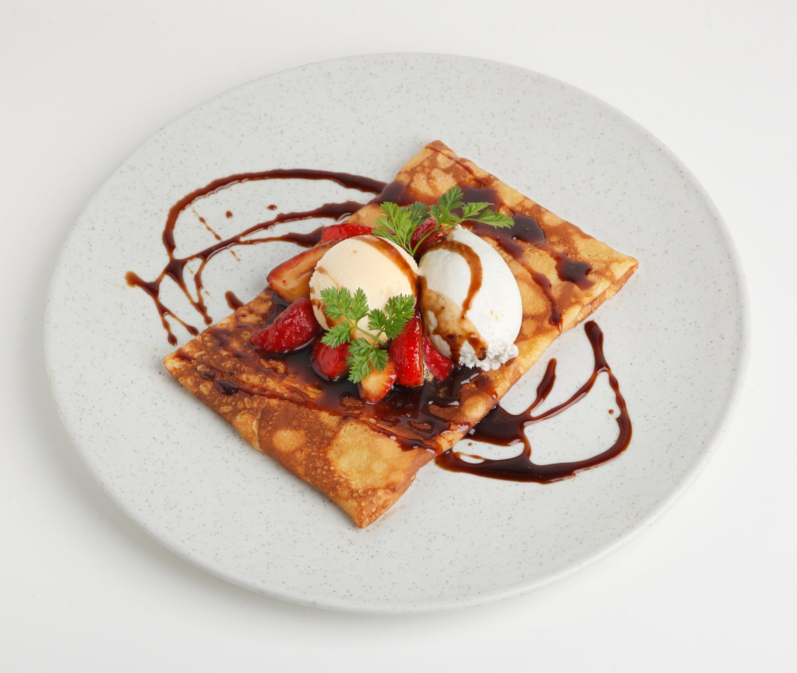 甘さと酸味のバランスが良いとちあいかをたっぷり使用。いちごは自家製キャラメルブールサレとバルサミコ酢でソテーし、甘さを際立たせました。バニラアイスとホイップクリームを加え、なめらかなカスタードクリームをクレープで包んでいます。