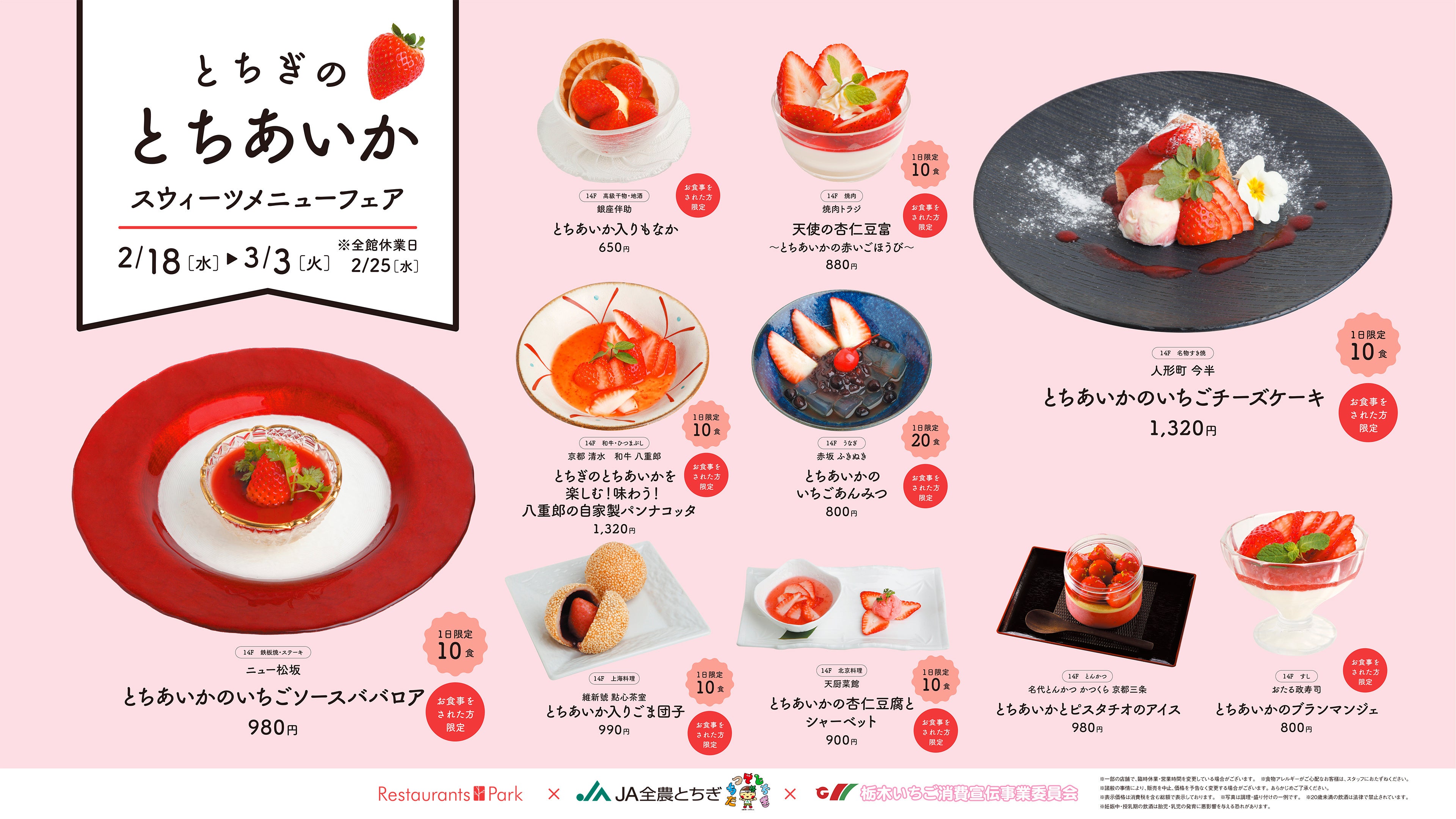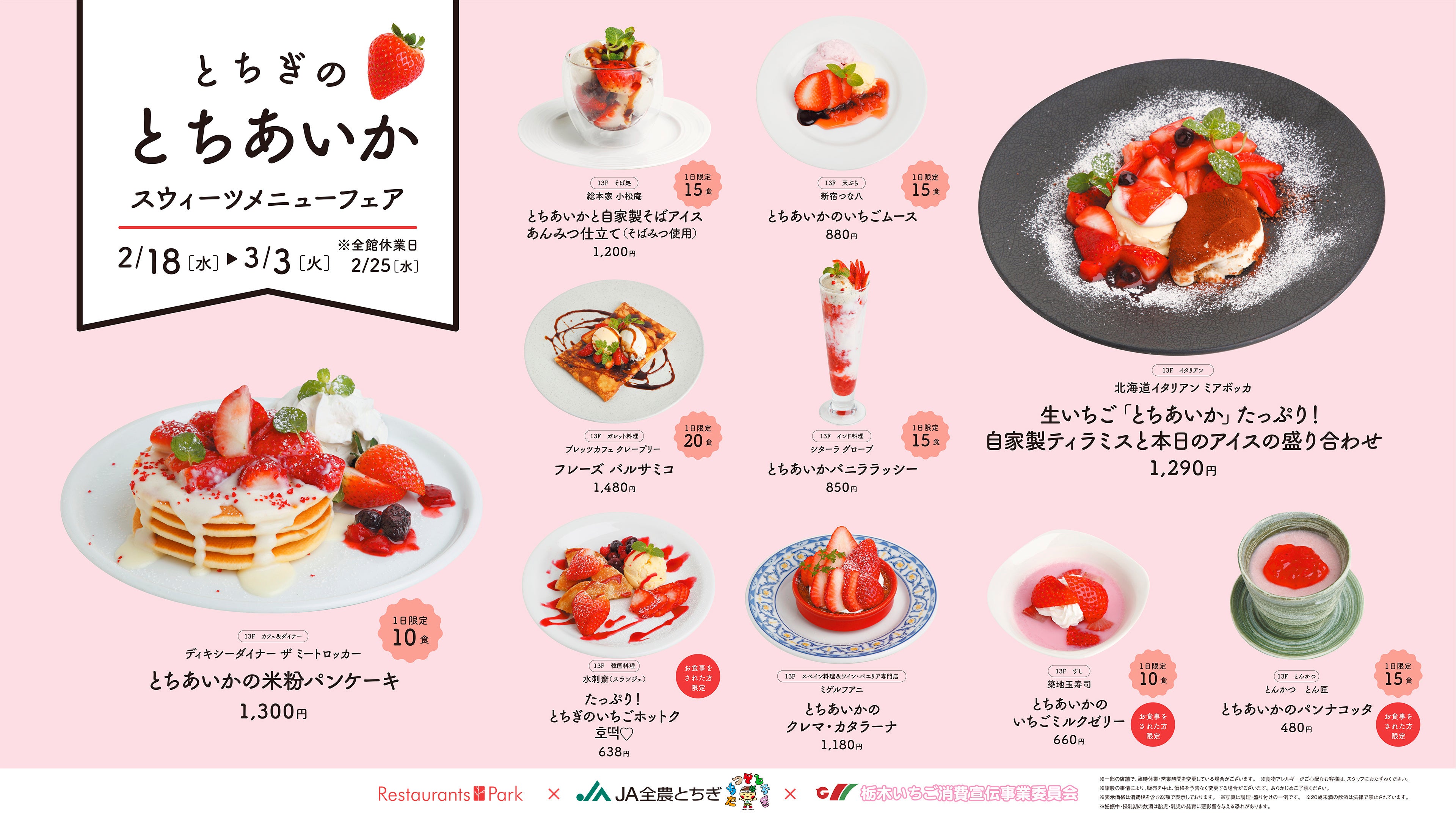 新宿タカシマヤ レストランズ パーク(12階~14階)30店舗で、JA全農とちぎと栃木いちご消費宣伝事業委員会提供の甘さ溢れるブランドいちご「とちあいか」を使用した期間限定オリジナルメニューをどうぞ。