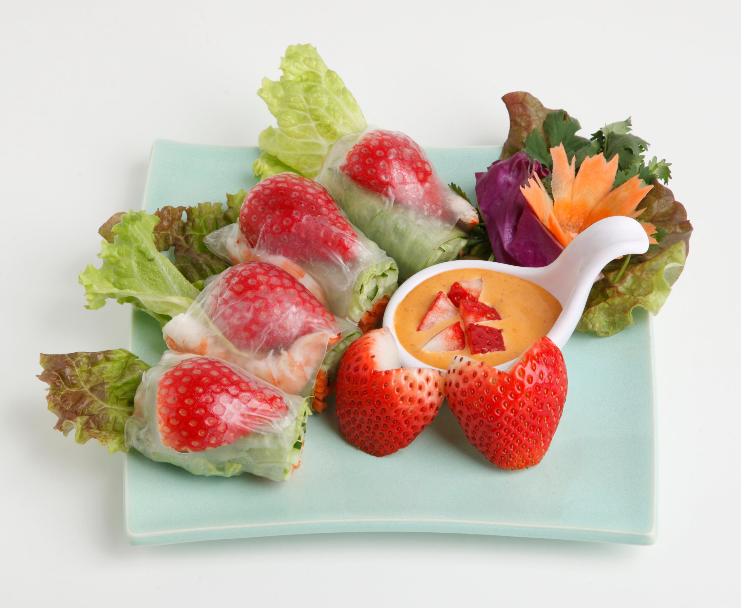 とちあいかとプリッとした海老を生春巻きで包みました。とちあいかの甘酸っぱさが引き立つ爽やかなメニューです。ハーブ香るトムヤムソースで、甘・酸・辛の三味同時体験を!