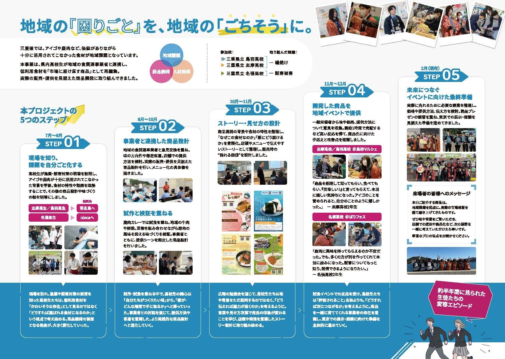 内容:本イベントでは、鳥羽高校・志摩高校・名張高校の生徒たちが、自ら商品のプレゼンテーションを行い、首都圏の食品バイヤーやメーカーに向けて、試食を交えながら商品とその背景にある地域課題、開発ストーリーを伝えました。