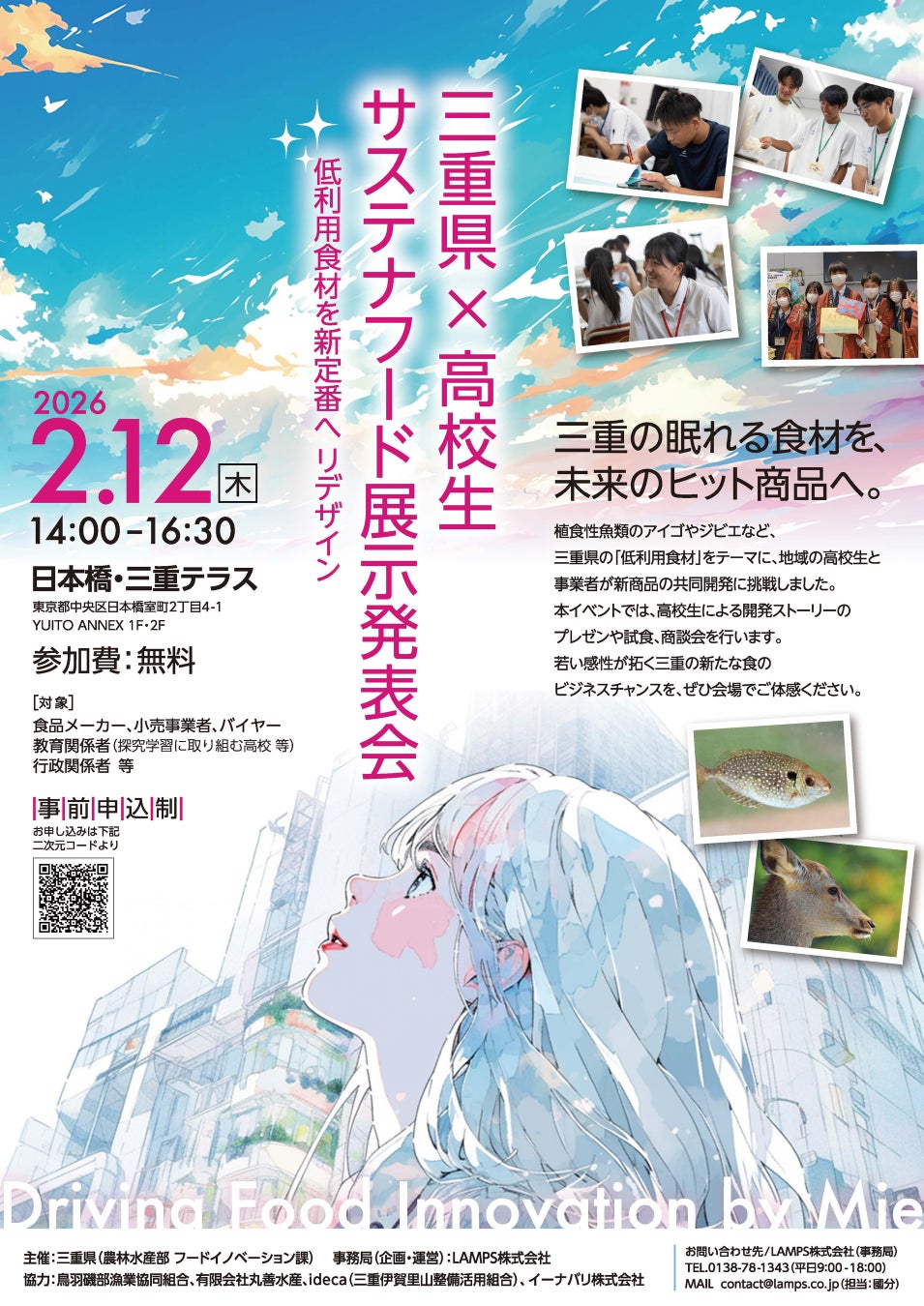 LAMPS株式会社(本社:北海道函館市 代表:國分晋吾)は、2026年2月12日(木)、東京・日本橋「三重テラス」にて、「三重県×高校生 サステナフード展示発表会 〜低利用食材を新定番へリデザイン〜」を開催しました。本イベントは、三重県農林水産部フードイノベーション課が推進する「県内高校生等と連携した低利用食材の利用拡大推進業務」の一環として実施。三重県立志摩高校・鳥羽高校・名張高校の生徒たちが、 地域の食品事業者と連携し、