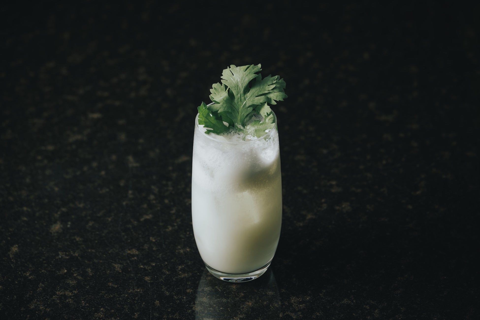 よもぎの爽やかな香りとミルクのまろやかさを合わせた和ハーブカクテル。よもぎの葉を添え、日本の春・新緑をイメージ。