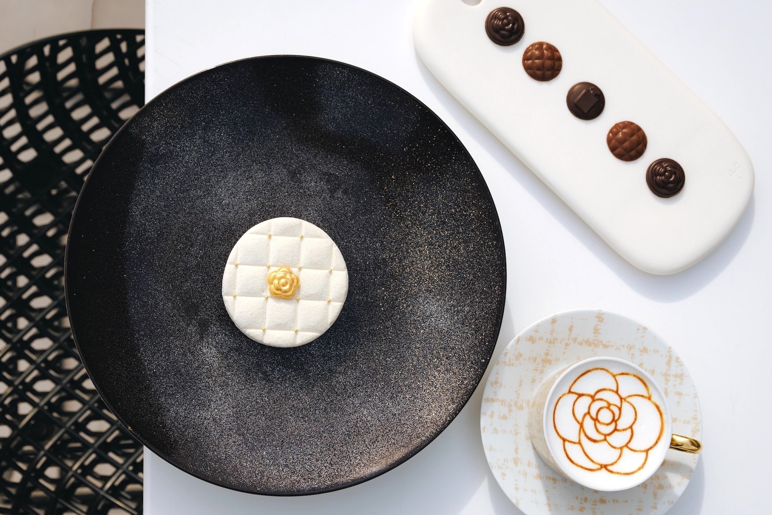 ゴールドのカメリアの形をしたチョコレートをあしらった、キルティングを思わせる真っ白なムースケーキに、カメリアなどをモチーフにした「ブトンショコラ」とドリンクを合わせた、エレガントで可憐なティーセット。