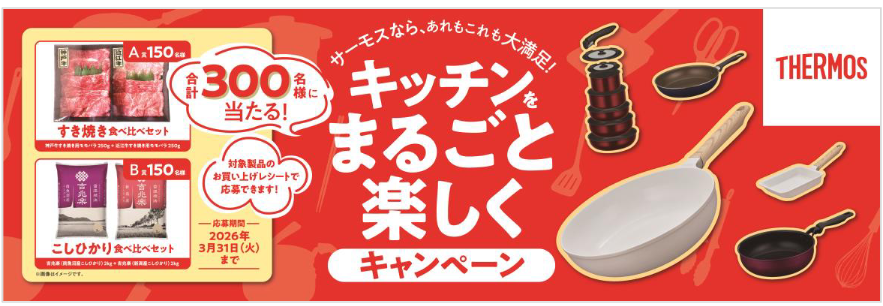 サーモスのフライパンや包丁などのキッチン製品を購入して応募!神戸牛&近江牛やお米食べ比べセットなどの豪華グルメが合計300名様に当たる キャンペーン応募期間:2026年3月31日(火)まで