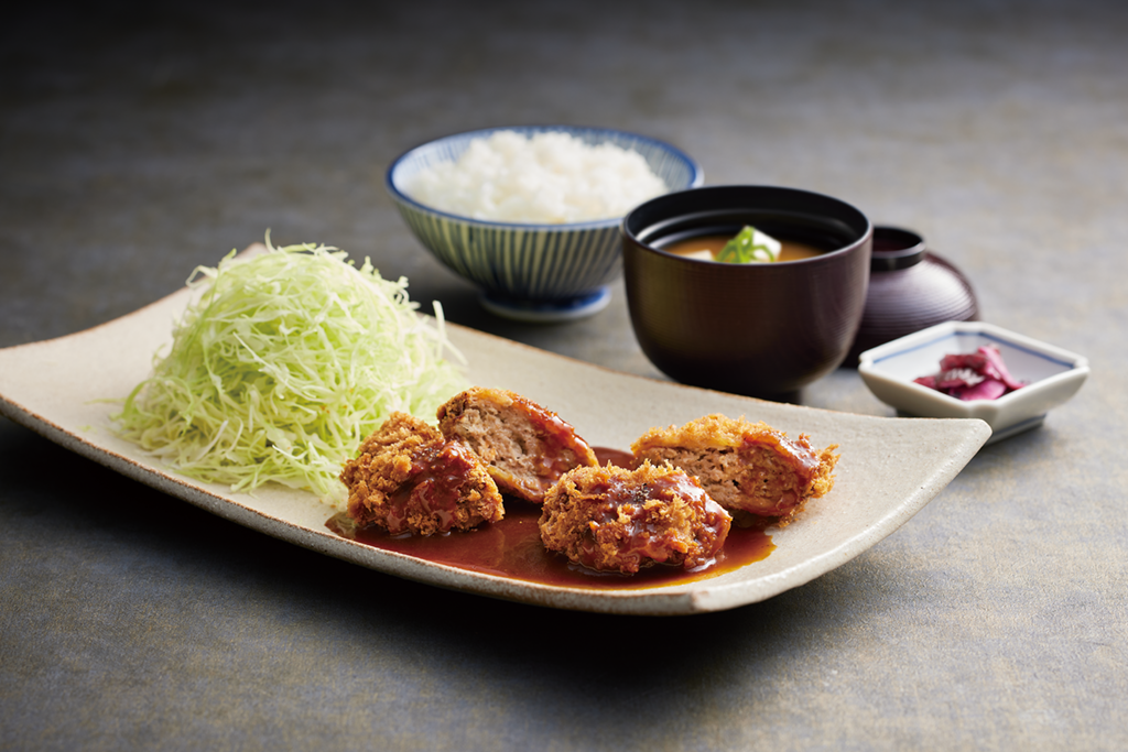 芳醇な香りとコクが広がるデミグラスソースをたっぷりとかけた粗挽きメンチかつ定食。噛むほどに肉汁があふれ出すジューシーなメンチかつと、独自の黄金ブレンドソースとの相性をぜひお楽しみください。