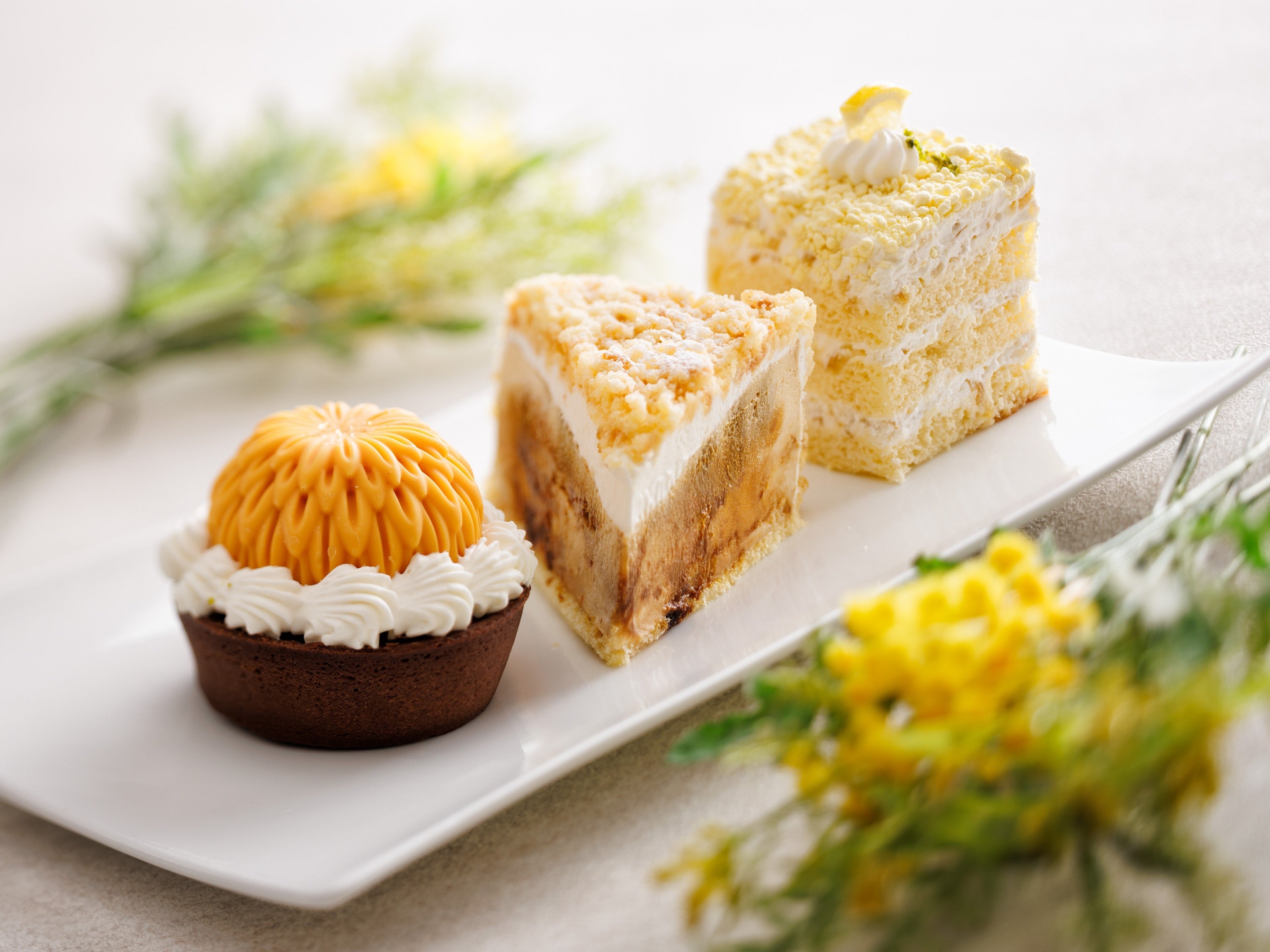 またスイーツは、春らしい軽やかな味わいと彩りにこだわった、3種のケーキをラインアップ。花をかたどったフルーツムースのチョコレートタルトや、2層仕立ての贅沢なチーズケーキ、レモンの爽やかな風味が楽しめるショートケーキなど、食後のデザートのほか、テイクアウトでもお楽しみいただけます。