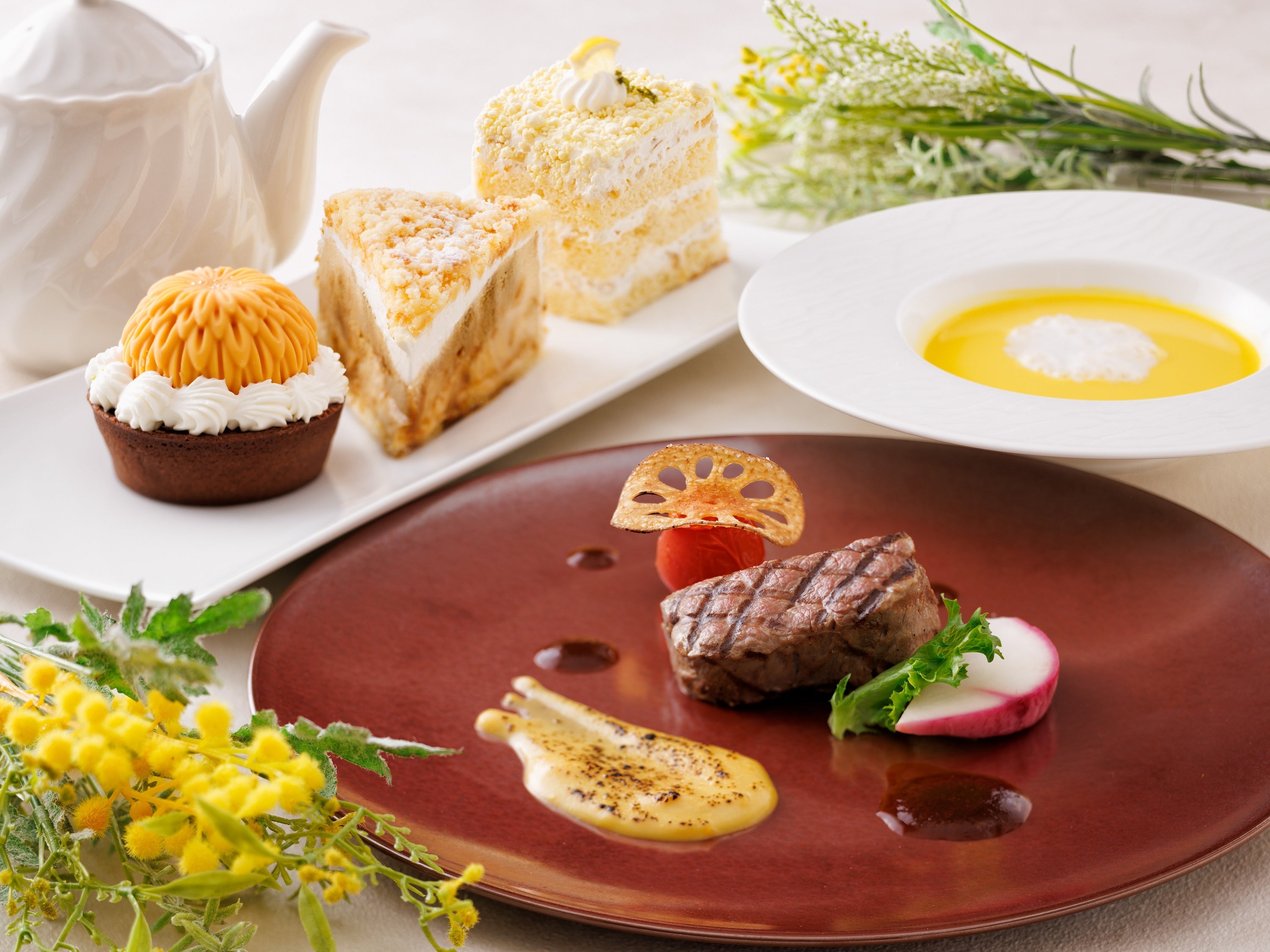 プリンセスミモザランチ・ディナーコースでは、カボチャの自然な甘みが広がるポタージュをはじめ、フレンチの王道ソース・オランデーズを添えた真鯛のムニエル、香ばしく焼き上げた牛肉のグリエにとうもろこしのブリュレを合わせるなど、ミモザを思わせるやわらかな黄色を一皿ごとに取り入れています。シェフの確かな技と素材を生かした味わいに加え、思わずカメラを向けたくなる華やかな盛り付けも魅力です。