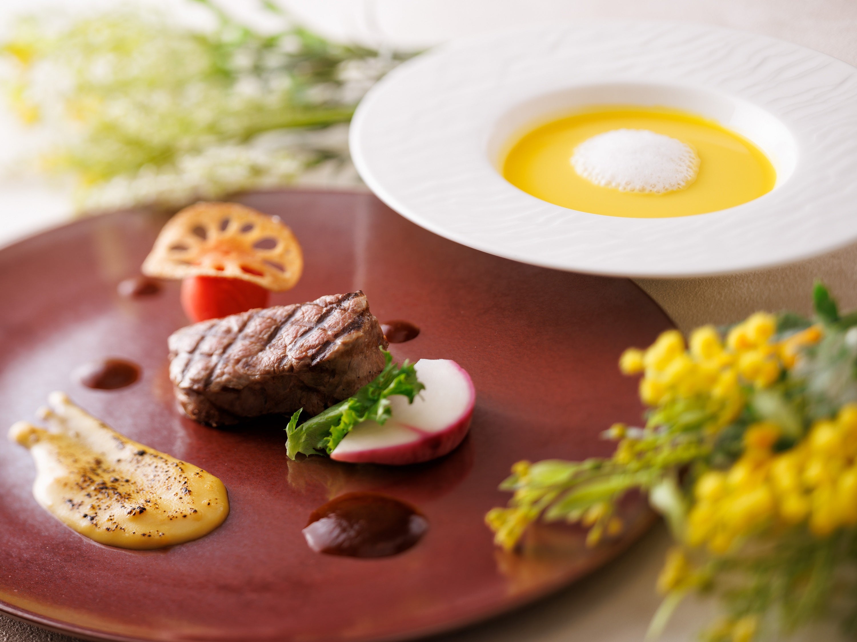 淡い黄色を取り入れたコース料理をご用意。カボチャのポタージュや真鯛のムニエル サフラン香るオランデーズソース、牛肉のグリエ とうもろこしのブリュレなど、春を思わせる彩りと香りを重ねた料理をお楽しみいただけます。