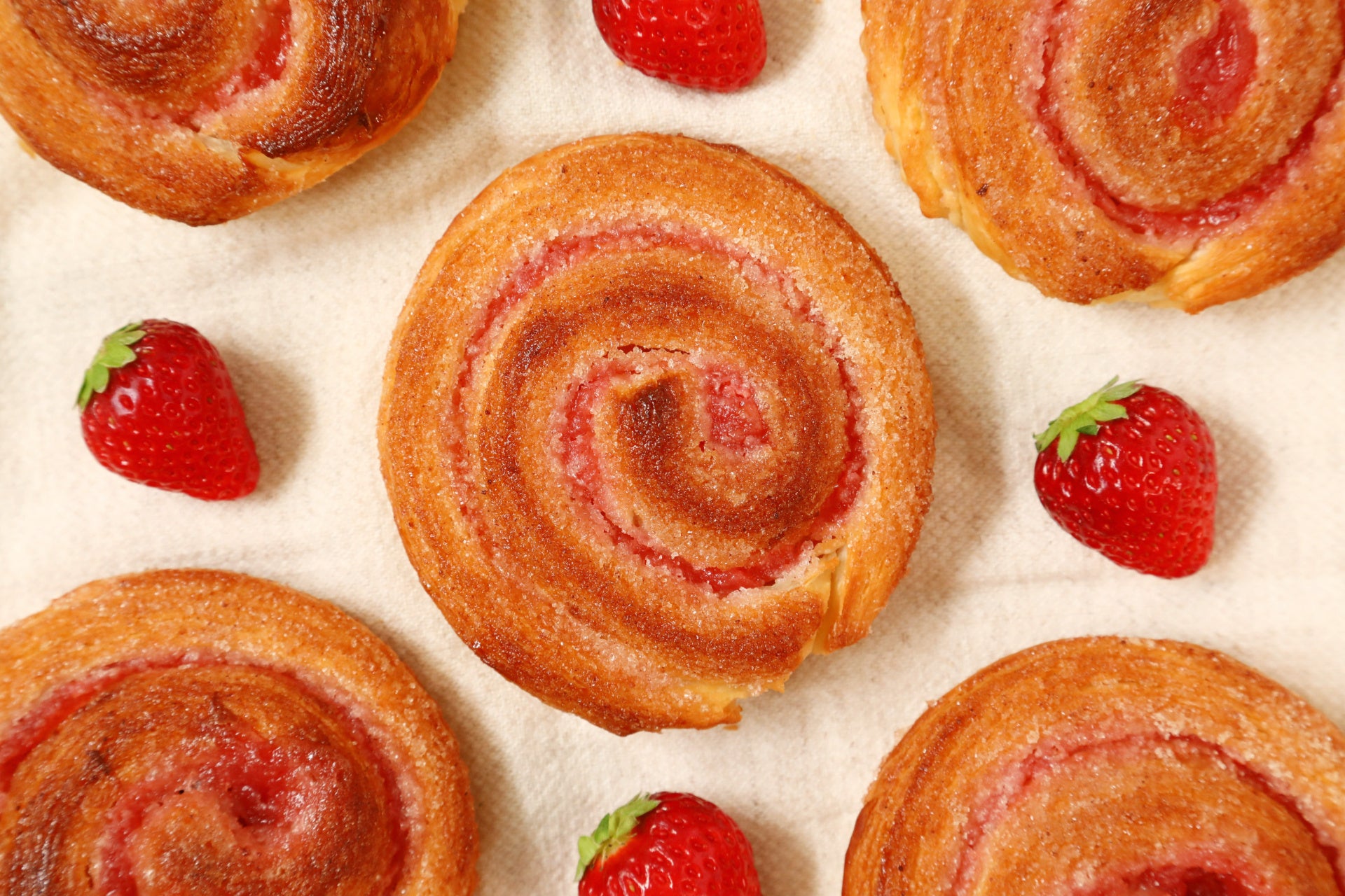 ーストを巻き上げ、表面にストロベリーシュガーをあしらってカリッ、サクッとした食感に