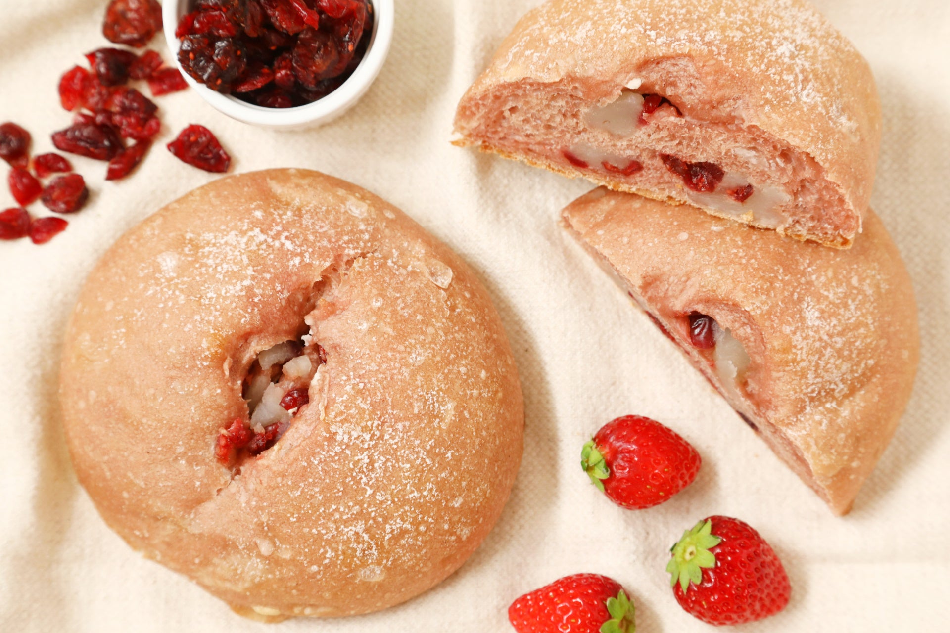 そしてこのたび2026年3月1日(日)より『ブール』の春限定フレーバー『白あんとクランベリーのストロベリーブール』を新発売いたします。いちご100%のパウダーを練りこんだブール生地は、ほんのり桜色に色づき、春の訪れを感じさせるビジュアルに。中に包んだ白あんとドライクランベリーの調和がまるで“苺大福”のような味わいを演出します。和の素材である白あんと洋の素材であるクランベリーを掛け合わせたことにより、和洋折衷なパンに仕上げた本商品は、お花見やピクニックなど、春の行楽のお供にぴったりです。