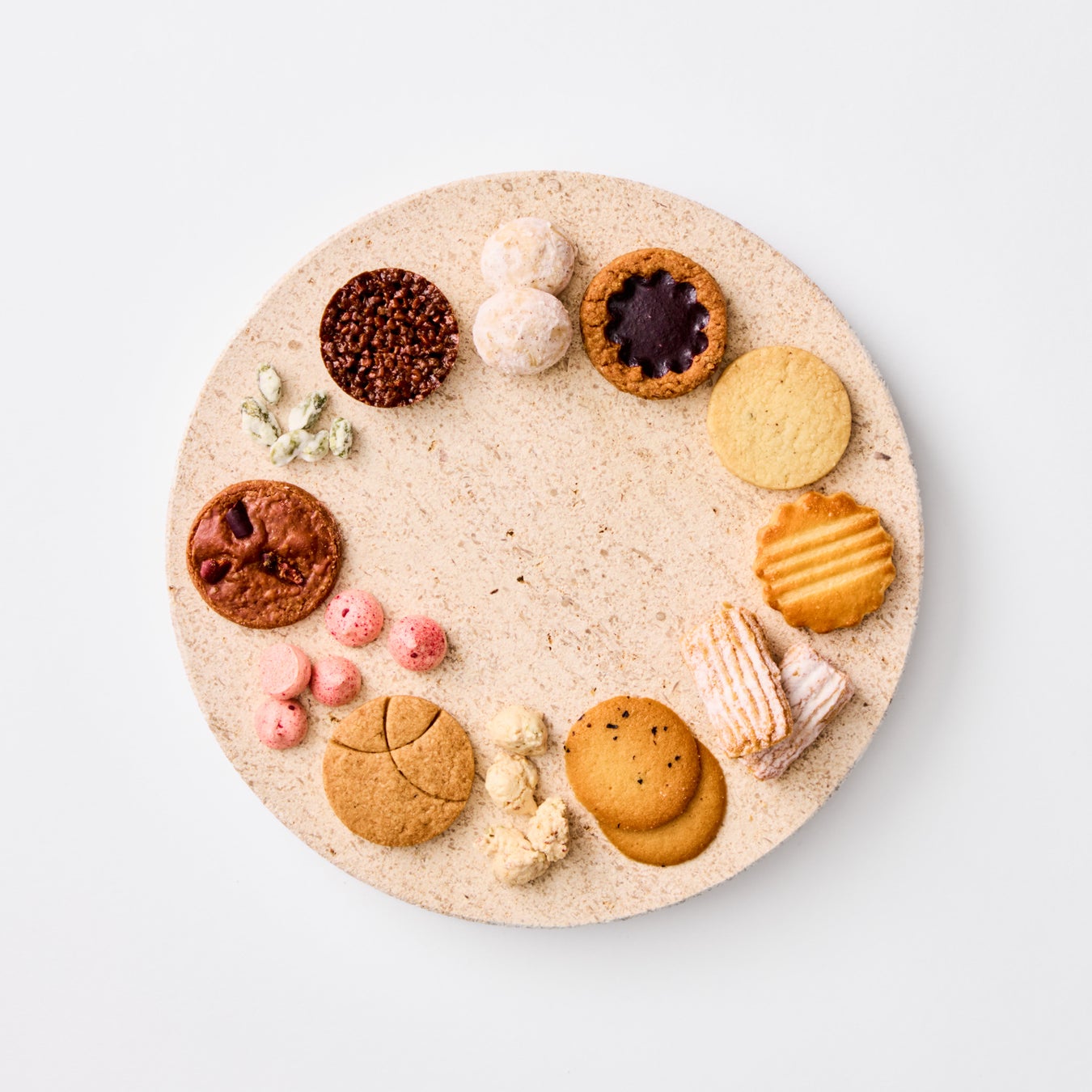 (皿盛り写真:上から時計回り)ブールド ネージュ★、リンツァー★ 、サブレ バニーユ、ガレット ナンテ★、サブレ カカウェット、チュイル ベルガモット★、クロッカン★ 、サブレ エピセ、ムラング フランボワーズ、サブレ カカオ、ピスターシュ スクレ★ 、フロランタン カフェ