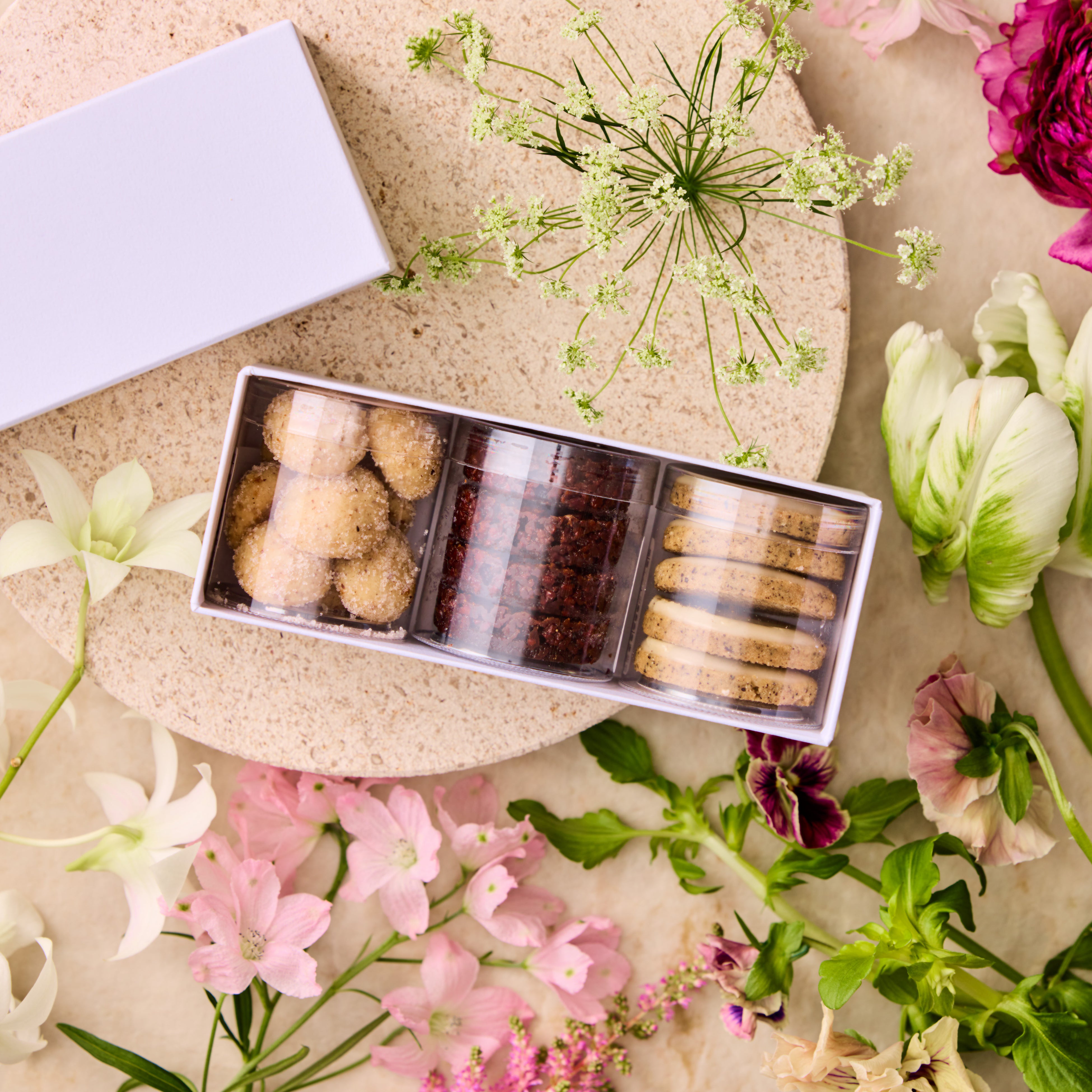 今回特別にご用意した、3個入りギフトボックス。人気の焼菓子3種をセットにしてご用意しました(写真は左から:ブール ド ノワゼット シトロン/フロランタン カフェ/サブレ テ ベルガモット)。事前予約なら、お好きな組み合わせにアレンジいただけます。日頃の感謝を伝える“プチギフト”にぴったりです。