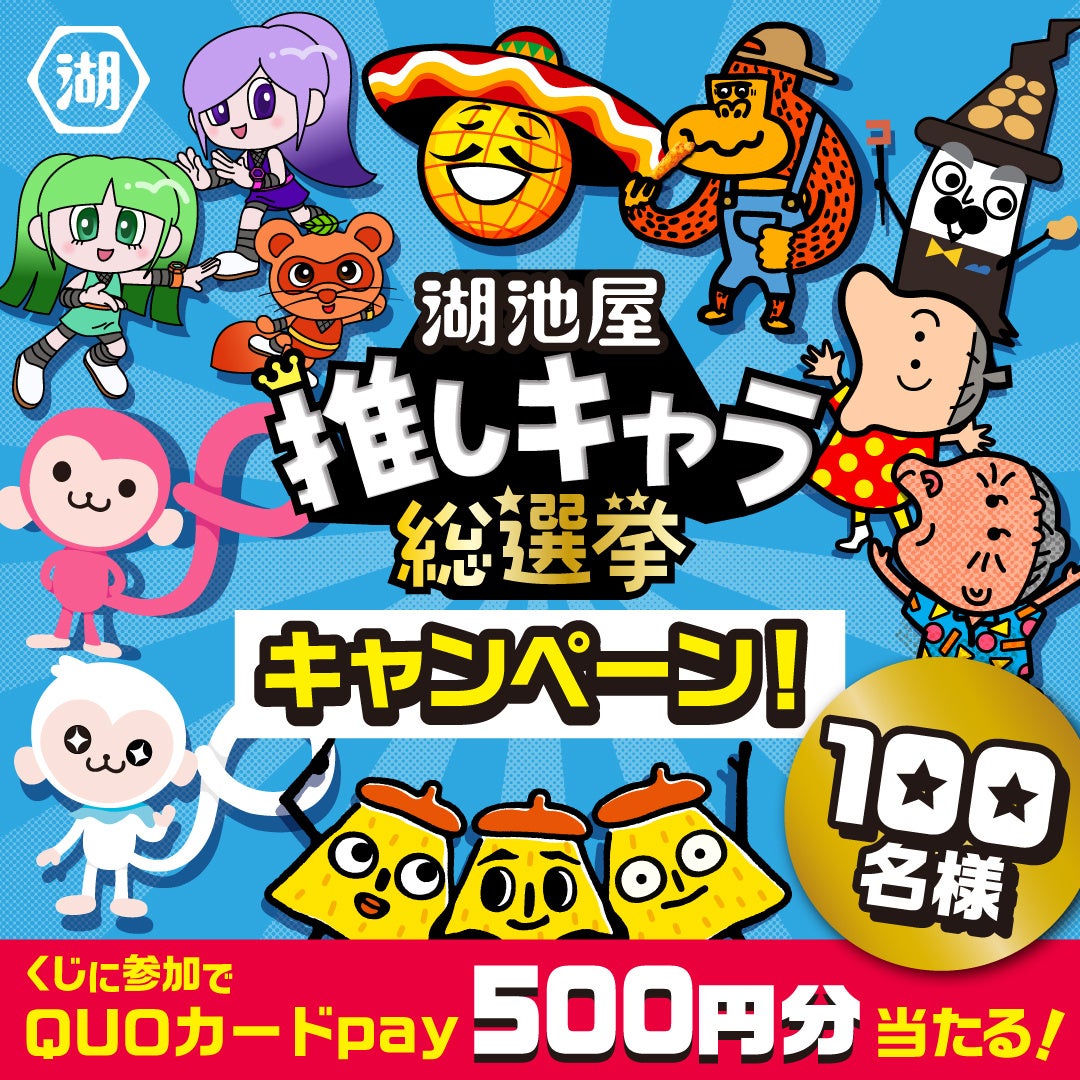 「湖池屋推しキャラ総選挙」の開催を多くのお客様に知っていただきたいとの想いから、Xで応募するキャンペーンも同時開催します。抽選で100名様に「QUOカードPay 500円分」が当たります。「湖池屋GOGO!ランド」内で実施する「湖池屋推しキャラ総選挙」とあわせて、こちらもぜひご参加ください!