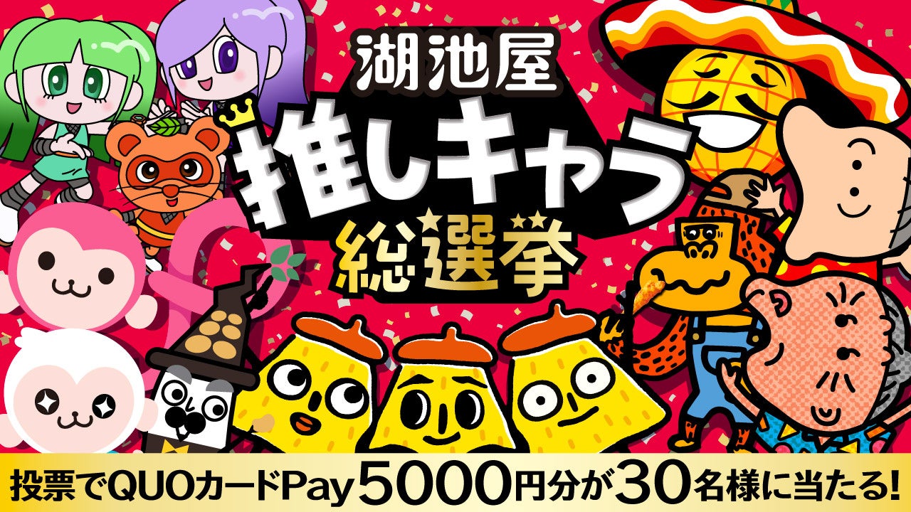 当サイトの開設を記念し、ファンサイト内にて「湖池屋推しキャラ総選挙」を実施します。本企画では、湖池屋を代表する9キャラクターの中から、ファンの皆さまの投票によって1位を決定します。投票にご参加いただいた方全員に、サイト内で使用できる「100ポテマイル」をプレゼント。さらに、抽選で30名様には「QUOカードPay 5,000円分」が当たります。