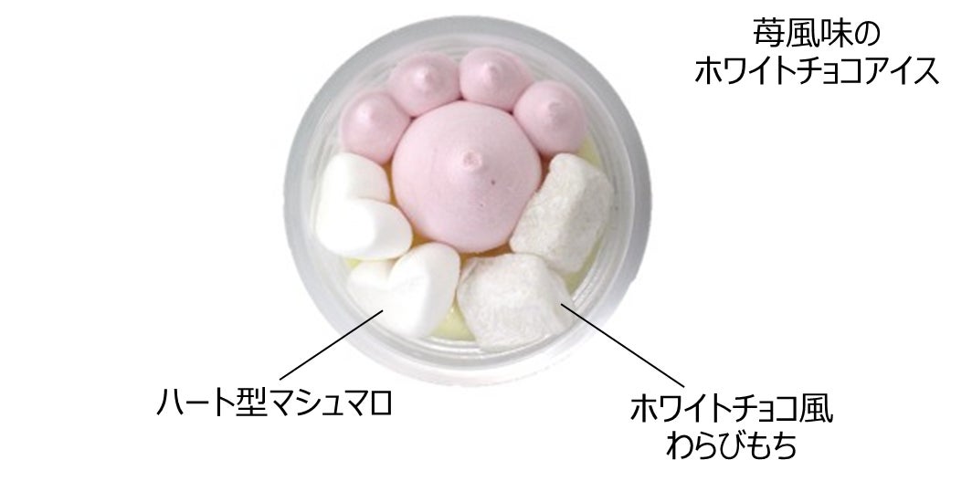 猫の日にちなみ、肉球をモチーフとした特別感のある見た目が魅力。ピンクの肉球部分は苺風味のホワイトチョコアイス、白い部分はハート型マシュマロとホワイトチョコ風わらびもちです。
