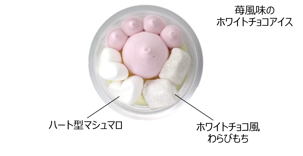 猫の日にちなみ、肉球をモチーフとした特別感のある見た目が魅力。ピンクの肉球部分は苺風味のホワイトチョコアイス、白い部分はハート型マシュマロとホワイトチョコ風わらびもちです。