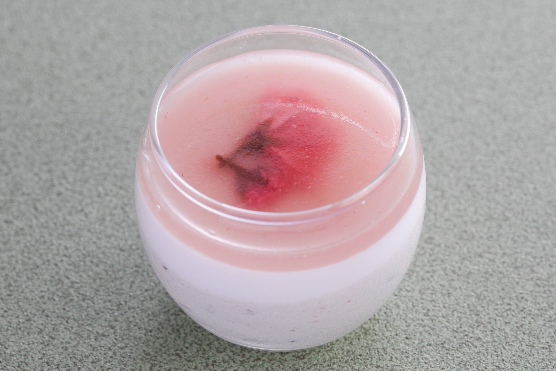 小倉あんのムース、桜のブラン・マンジェ、いちごのジュレを層にし、桜の花の塩漬けをトッピングしました。