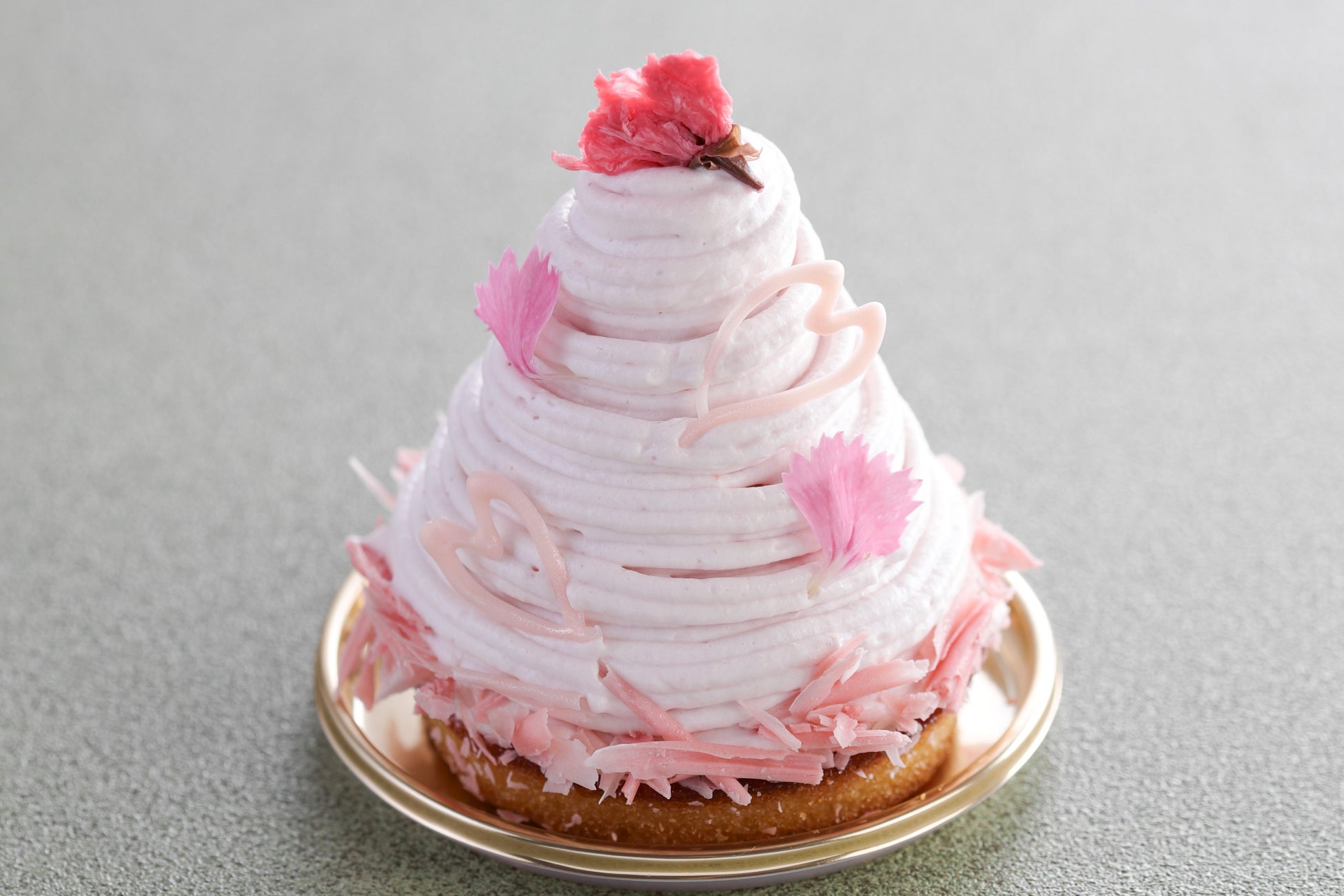 チェリーを入れたアーモンド生地にいちごのジュレを閉じ込めた桜のムースをのせ、桜風味のいちごクリームを絞りました。