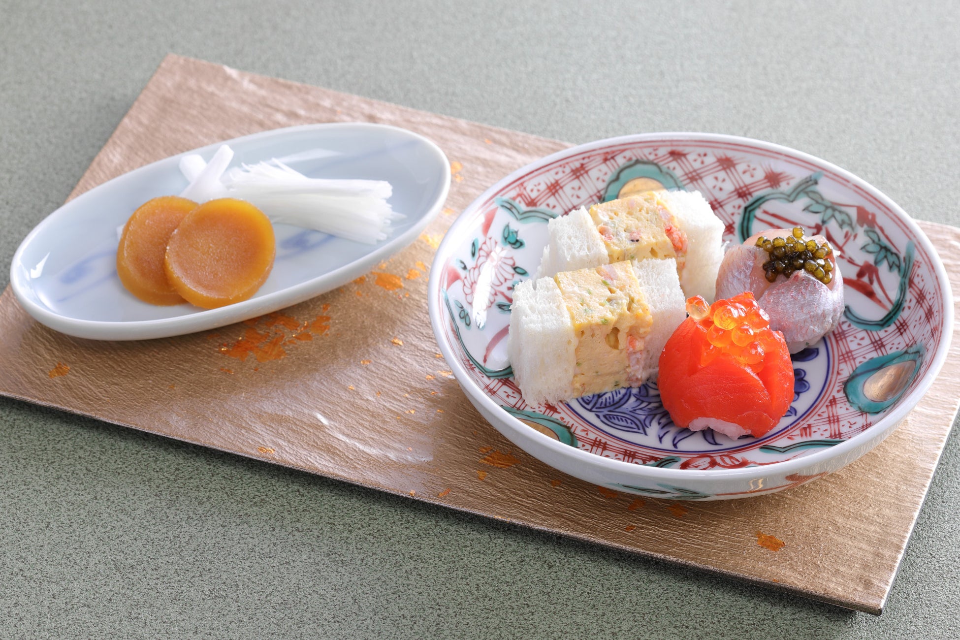 桜海老の出汁巻きサンド / 小鯛昆布〆手毬寿司 キャビア添え / 燻製サーモン手毬寿司 いくら添え / からすみ