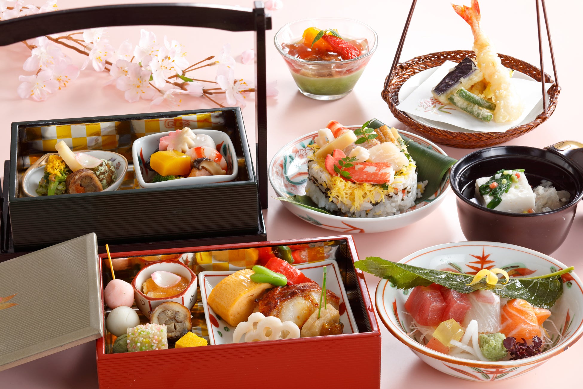 花見団子など春を感じる色鮮やかなお料理を盛り込んだ手提げ弁当。別皿で提供する造りやちらし寿司、デザートは、見た目も華やかな春らしい盛り付けで、ホテルにいながらお花見気分をお楽しみいただけます。