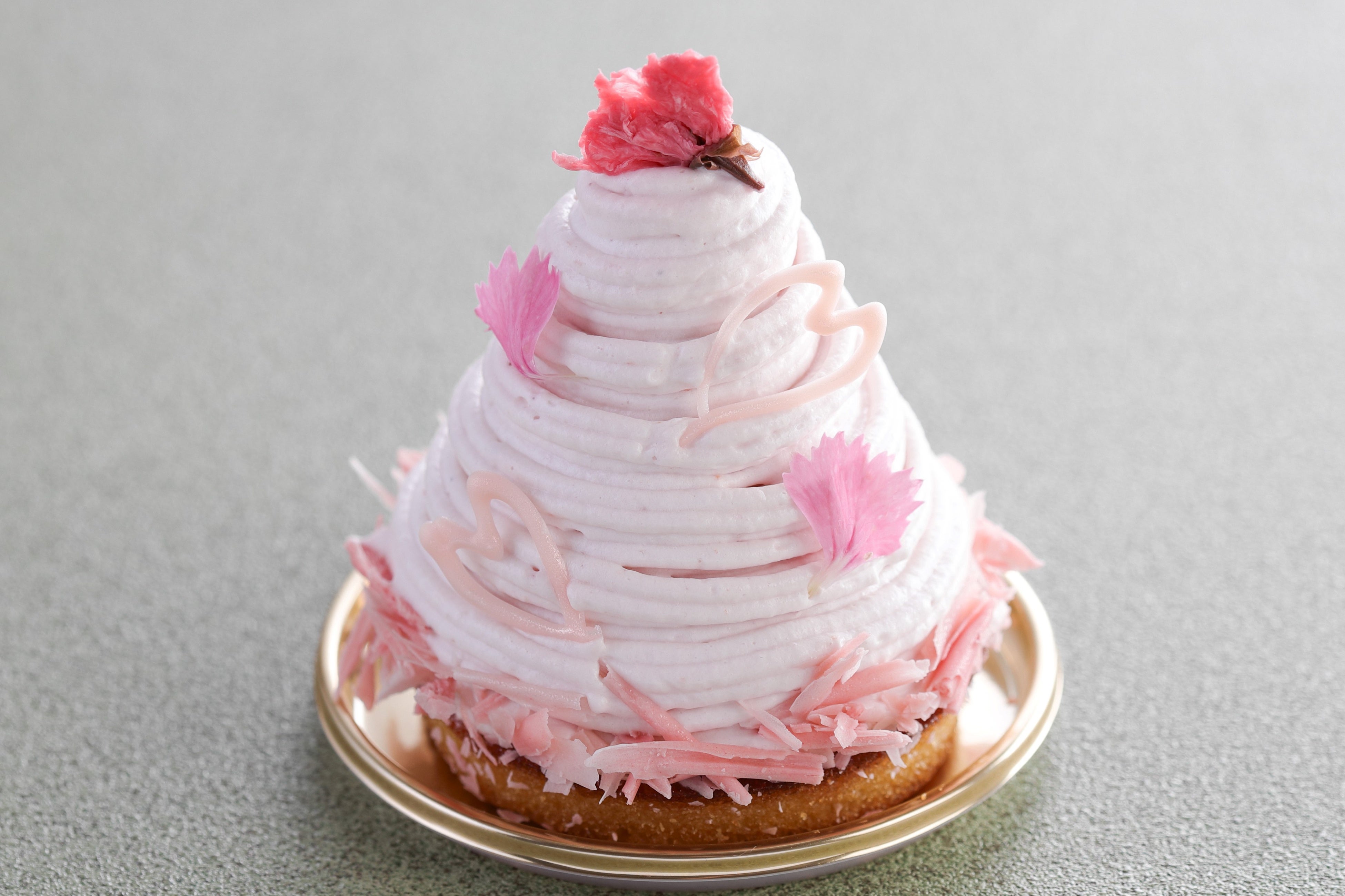 チェリーを入れたアーモンド生地にいちごのジュレを閉じ込めた桜のムースをのせ、桜風味のいちごクリームを絞りました。