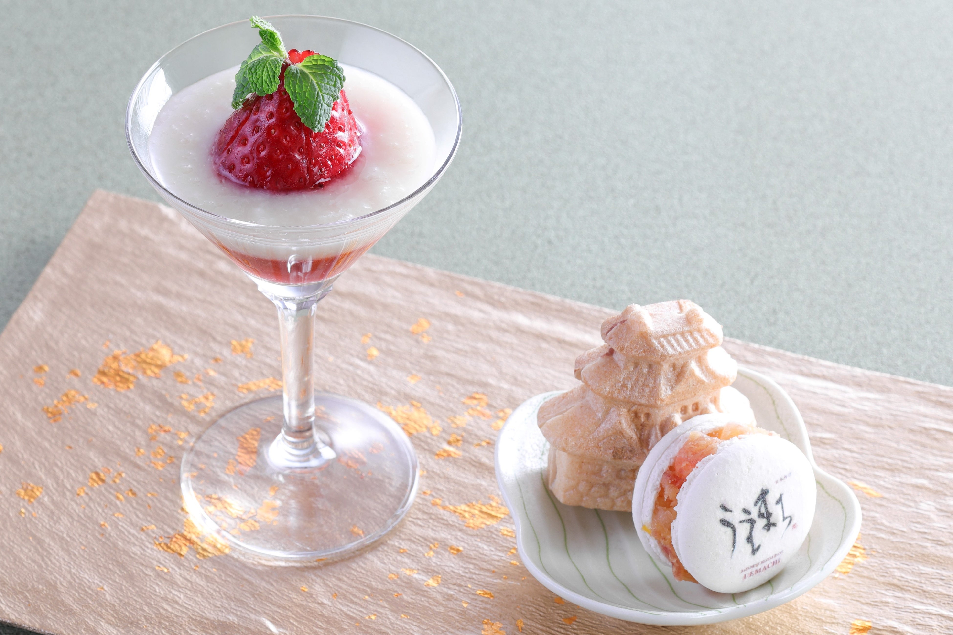 小倉あんのムース、桜のブラン・マンジェ、いちごのジュレを層にし、桜の花の塩漬けをトッピングしました。