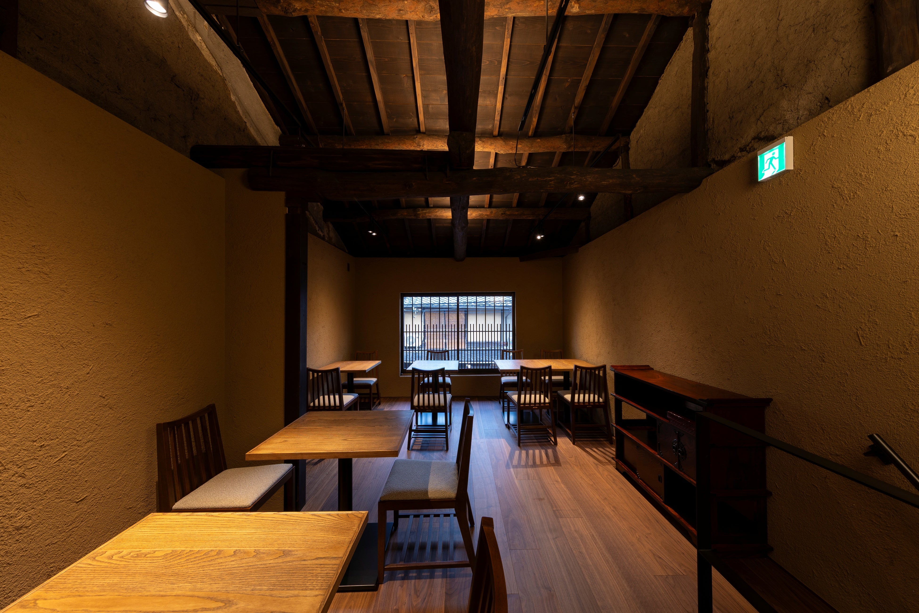 舞台となるのは、大正期に建てられた趣深い京町家。歴史を刻んだ梁や柱を活かしつつ、洗練されたモダンなインテリアを配しました。カウンター席や、味噌樽を配した中庭を愛でる個室、2階の開放的なテーブル席など、24席の静謐な空間でゆったりとした時間をお過ごしいただけます。