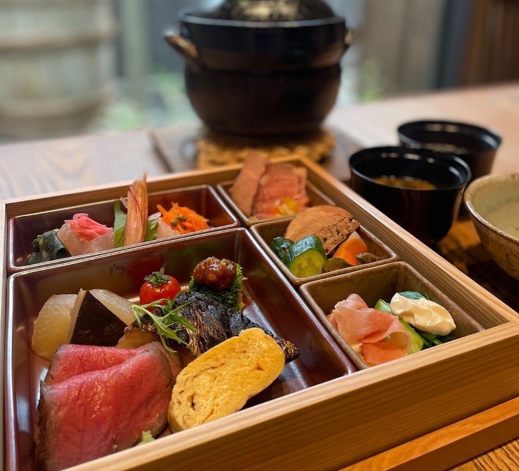蓋を開ける瞬間のときめきを閉じ込めた、目にも鮮やかなランチ限定ボックス。蔵代味噌から仕入れる全国の味噌を料理ごとに使い分けるのはもちろん、自家製の醤(ひしお)や麹で旨みを引き出した焼き物など、多彩な発酵食材を少しずつ贅沢に詰め合わせました。