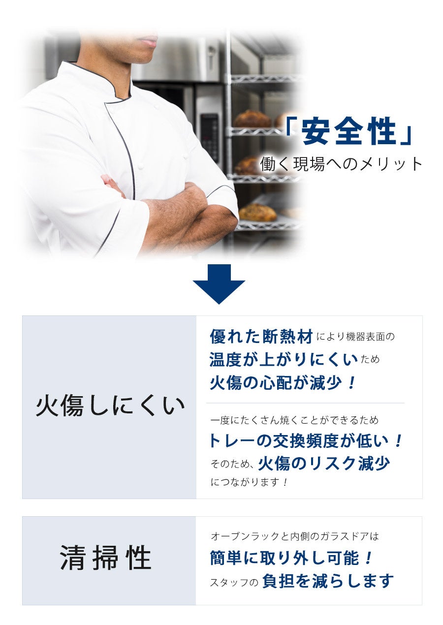 トレーを自動で回転させ熱風を均一に循環しながら焼成。トレーの入れ替えも不要。焼きムラを大幅に軽減し、ワンランク上の上質な焼き上がりを実現。
