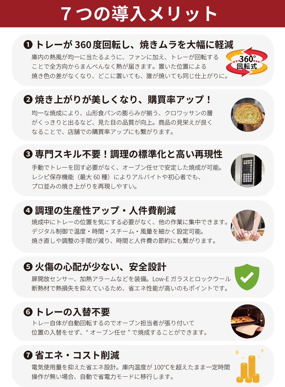 ⑥ 手間のかかるトレー入替が不要 自動回転により、焼きムラを防ぐための「トレーの前後入替」作業が一切不要に。“オーブン任せ”のノンストレスなオペレーションを可能にします。