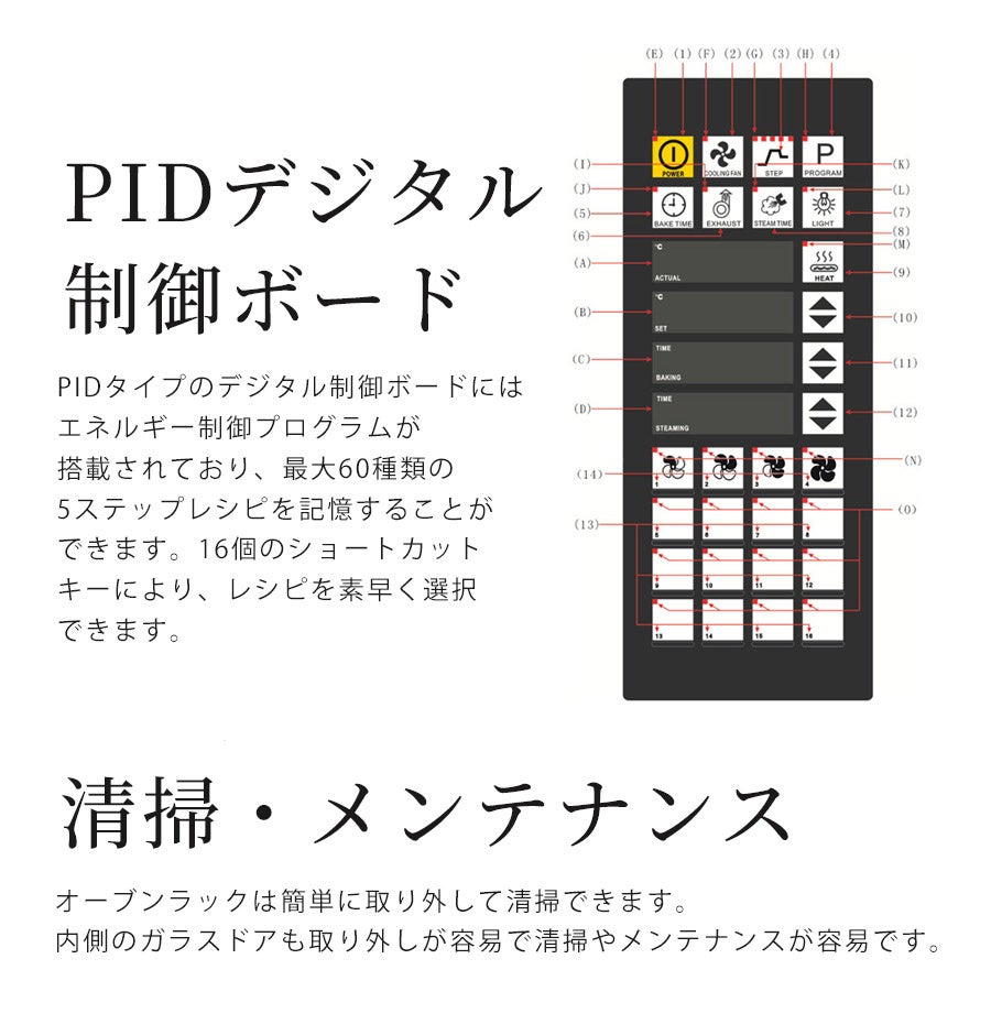 PID方式のデジタル制御ボードで、温度・時間・スチーム・風量を自由に組み合わせて最大60種類のレシピ保存が可能。16個のショートカットキーでレシピを瞬時に選択。