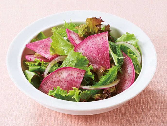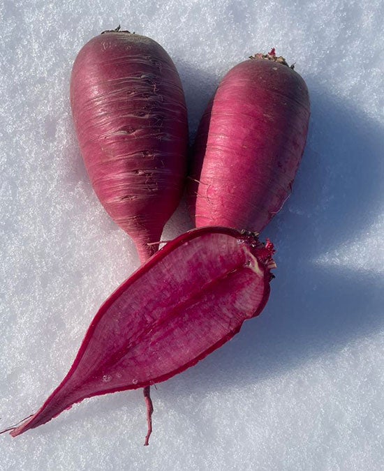 貯蔵してもシャキシャキ食感でみずみずしく辛みもない、サラダで食べるとおいしい赤大根です。皮も中身も深みのある濃い鮮やかな赤色が特徴で食卓が華やぎます。