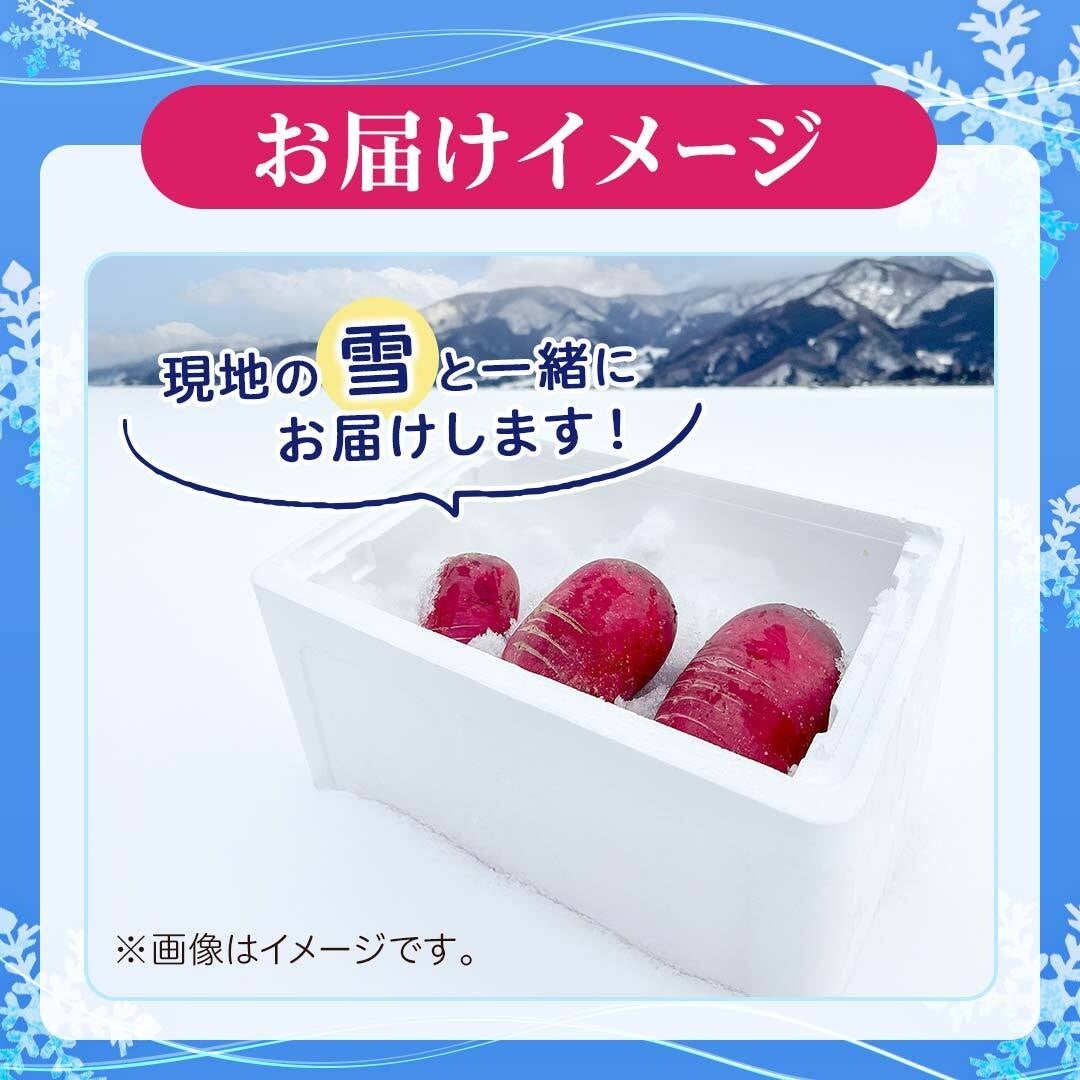 プレゼント内容:長野県産「紅くるり大根」3本を、現地の雪と一緒に箱詰めにしてお届けします。